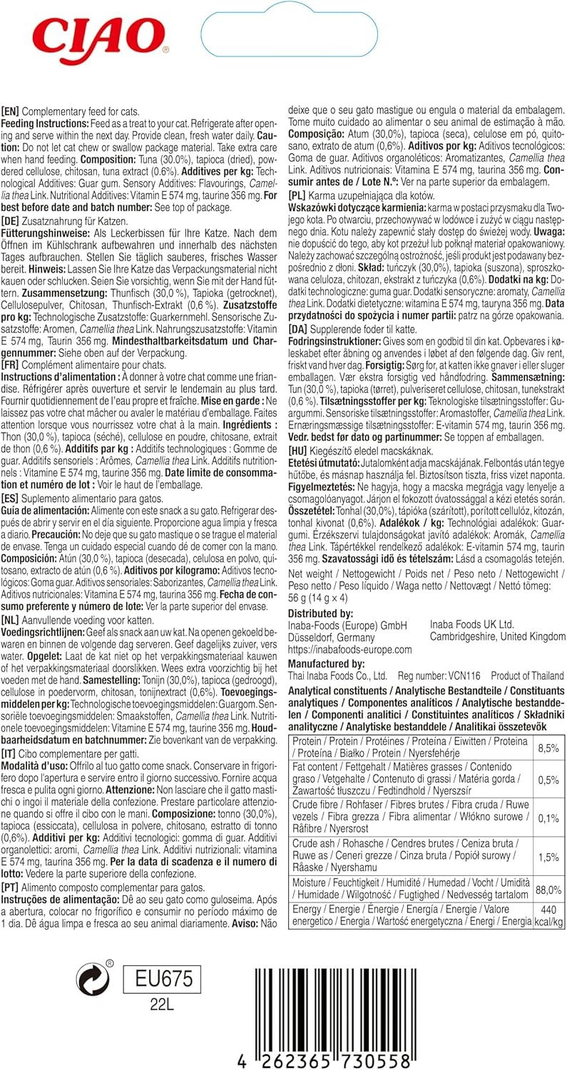 Machen Sie das Futter Ihrer Katze noch schmackhafter und besonders gesünder mit den natürlichen, getreidefreien und absolut unwiderstehlichen Toppings von INABA Churu. Churu ist ein luxuriös cremiges und freundliches Püree, das Katzen auf der ganzen Welt lieben. Außergewöhnlich lecker und mit Zutaten höchster Qualität zubereitet, können Sie den Unterschied in Textur und Geruch unserer Toppings erkennen. Alle unsere Produkte sind frei von Getreide, Kartoffeln, Füllstoffen und Derivaten. Unser Versprechen: natürliche, cremige und unwiderstehliche Zutaten, Zuchthuhn, nachhaltige Meeresfrüchte, delfinsicherer Thunfisch und nichts Künstliches. Wir stellen seit 1805 Lebensmittel für Menschen her und alle unsere Leckereien werden in unserer hochmodernen Anlage aus hochwertigsten, nachhaltig gewonnenen Zutaten hergestellt. Alle unsere Leckerlis enthalten zusätzliche funktionelle Inhaltsstoffe wie Grüntee-Extrakt, natürliches Kollagen und Vitamin E. Unsere Verpackungstechnologie stellt sicher, dass unsere Leckerlis ohne künstliche Konservierungsstoffe weich und feucht bleiben, bis Ihr Haustier sie verzehren kann.