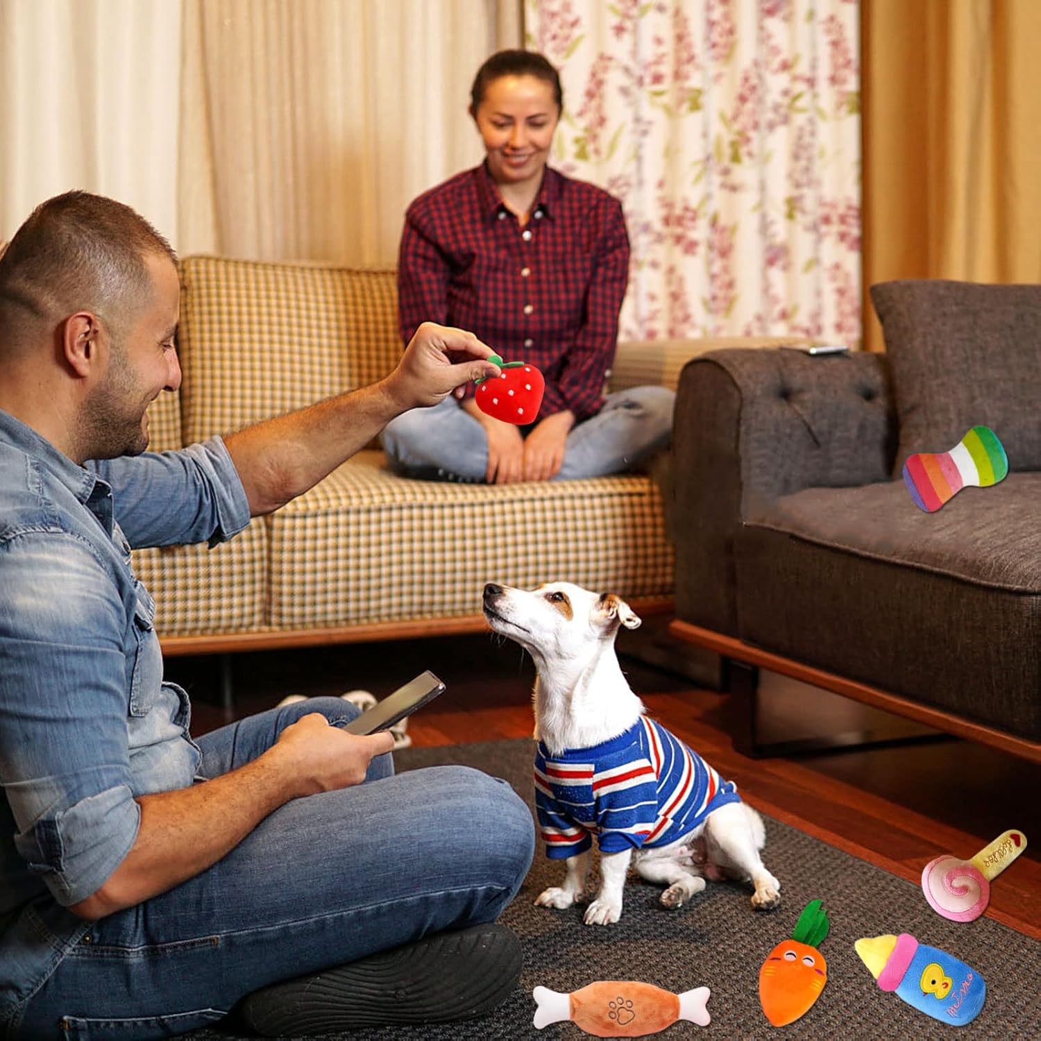 10-teiliges Plüsch-Hundespielzeug-Set: 10 Stück quietschende Plüsch-Hundespielzeuge, darunter: rosa Donut, grüne Sterne, rote Chili, Banane, Entlein, Hähnchenschenkel, Karotte, blaue Babyflasche, bunte Knochen, Wassermelone. Die Form- und Farbgestaltung gefällt Hunden. Und Hunde spielen sehr gerne und lange mit ihnen.