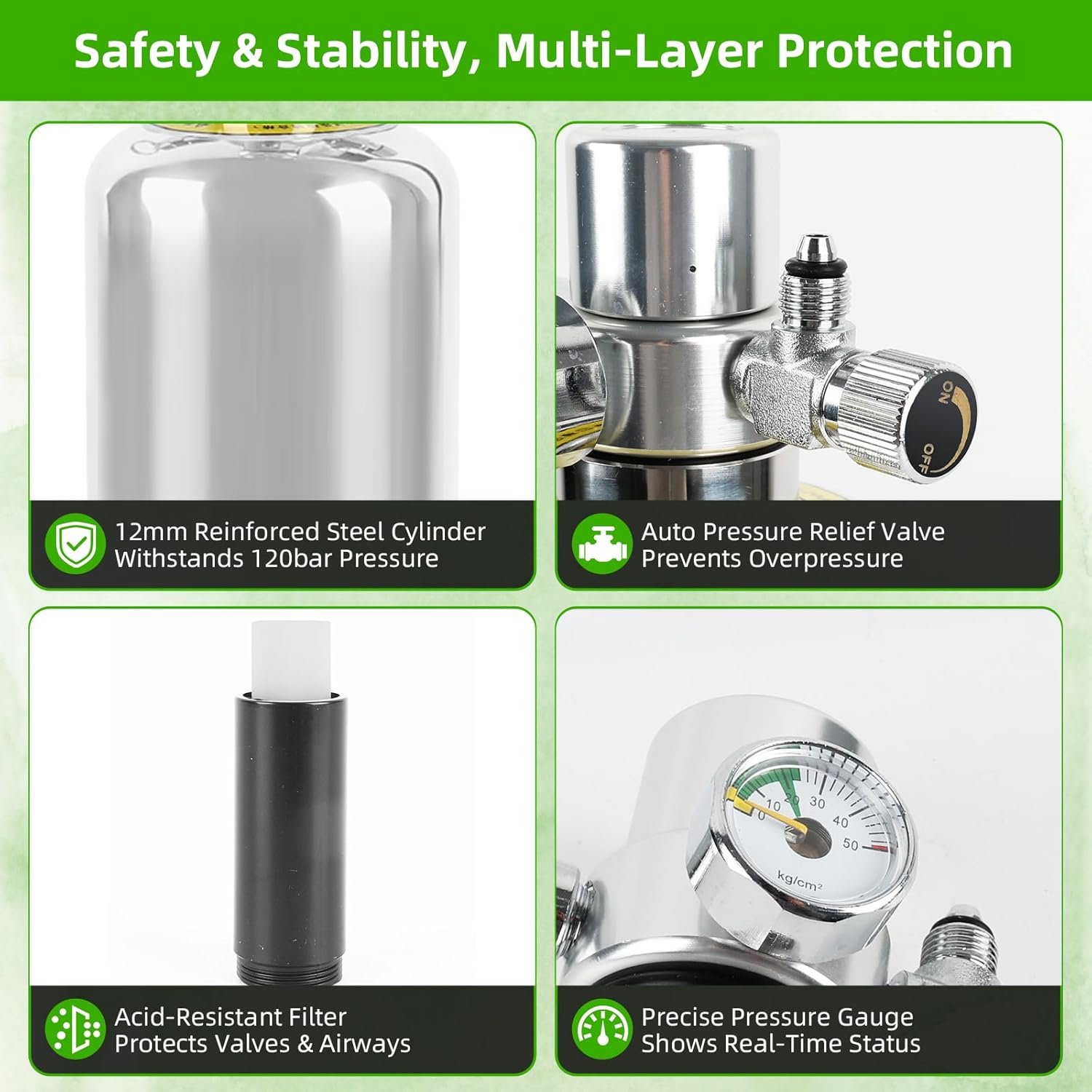 GENAUE ANZEIGE Ausgestattet mit einem präzisen Manometer, das genaue Messwerte liefert und Ihnen hilft, die Gasquelle rechtzeitig aufzufüllen. Das Gehäuse aus Aluminiumlegierung ist robust und korrosionsbeständig und eignet sich für feuchte Umgebungen. Selbst in der Nähe des Aquariums widersteht es Feuchtigkeit und verlängert so die Produktlebensdauer.
