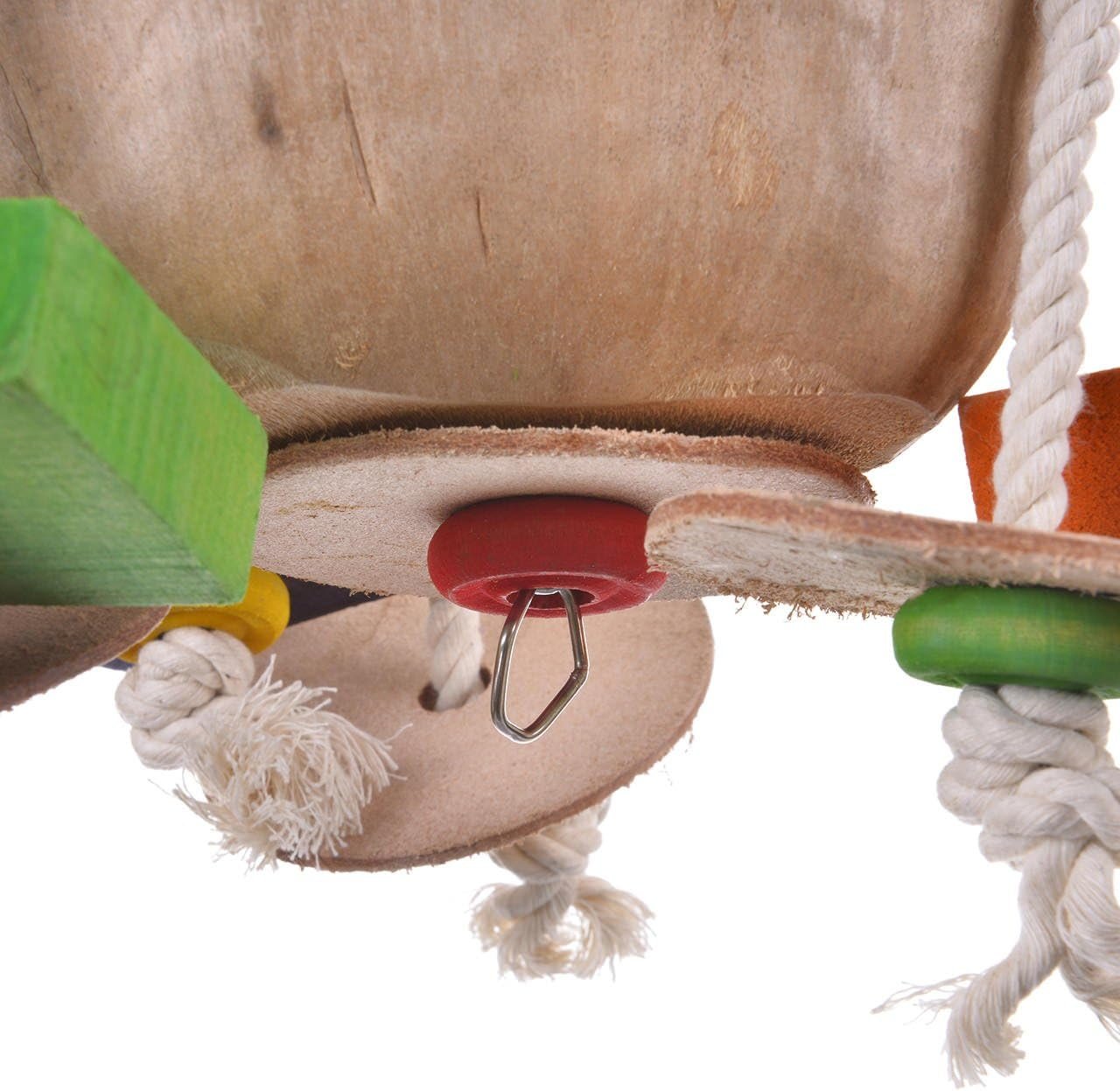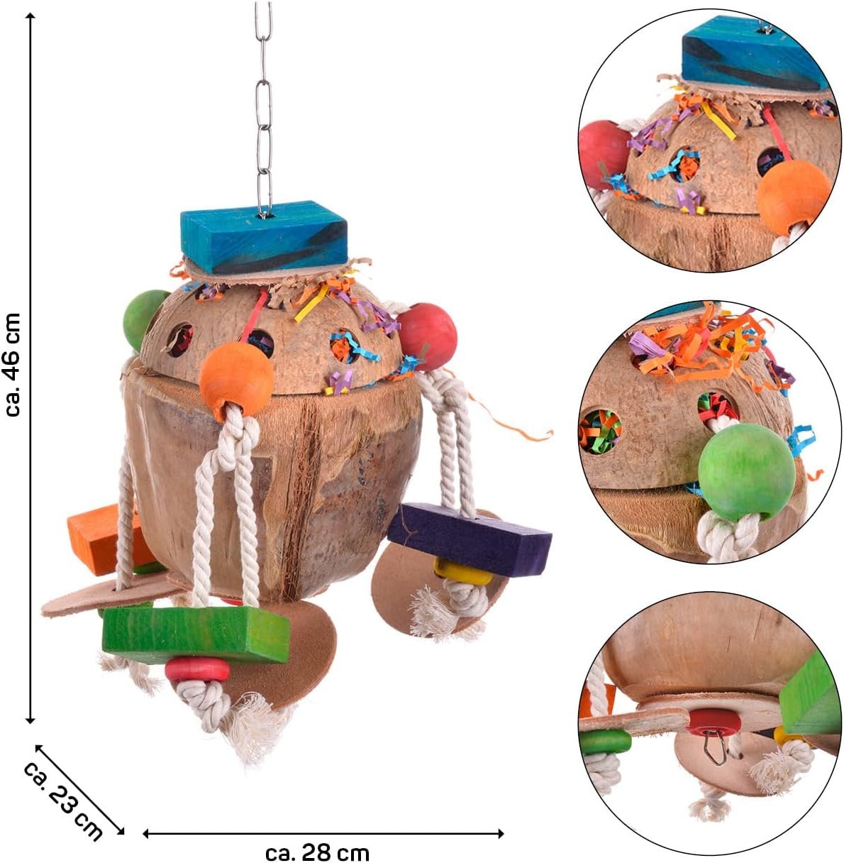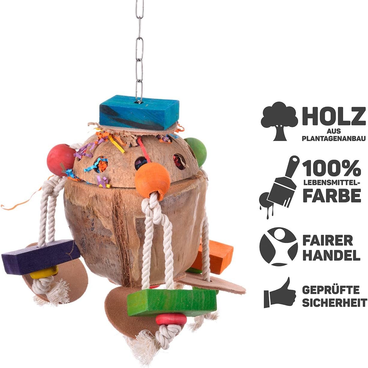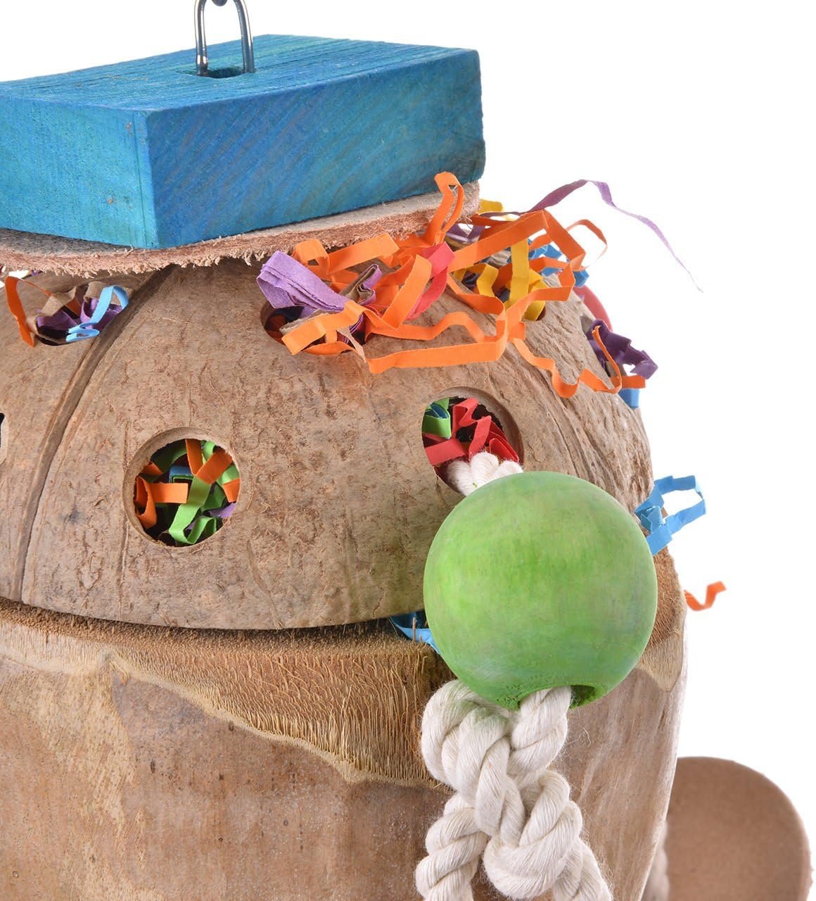 Der Coconut Treatholder Fun II ist das ideale natürliche Versteckspielzeug. Es besteht aus zwei kleinen Kokosnusshälften (eine geschält und mit Löchern, die andere Hälfte ist ungeschält), gefüllt mit den beliebten Papierstreifen und vielen bunten Holz- und Lederteilen. Der Coconut Treatholder Fun II wird mit einer Edelstahlkette befestigt. Alle Sittiche und Papageien lieben es, nach Herzenslust die Kokosfasern zu schälen, das Papier herauszuziehen oder die Holzteile zu zerdrücken und anzuknabbern.