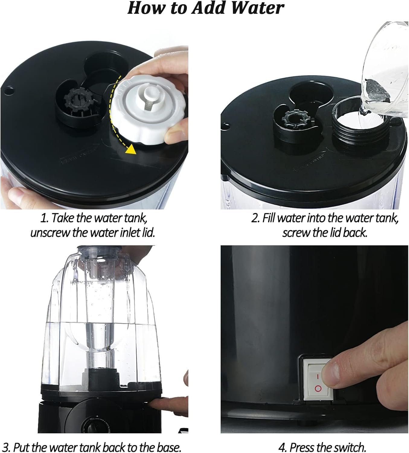 Nehmen Sie den Wassertank, öffnen Sie den Wassereinlassdeckel und gießen Sie Wasser in den Tank.