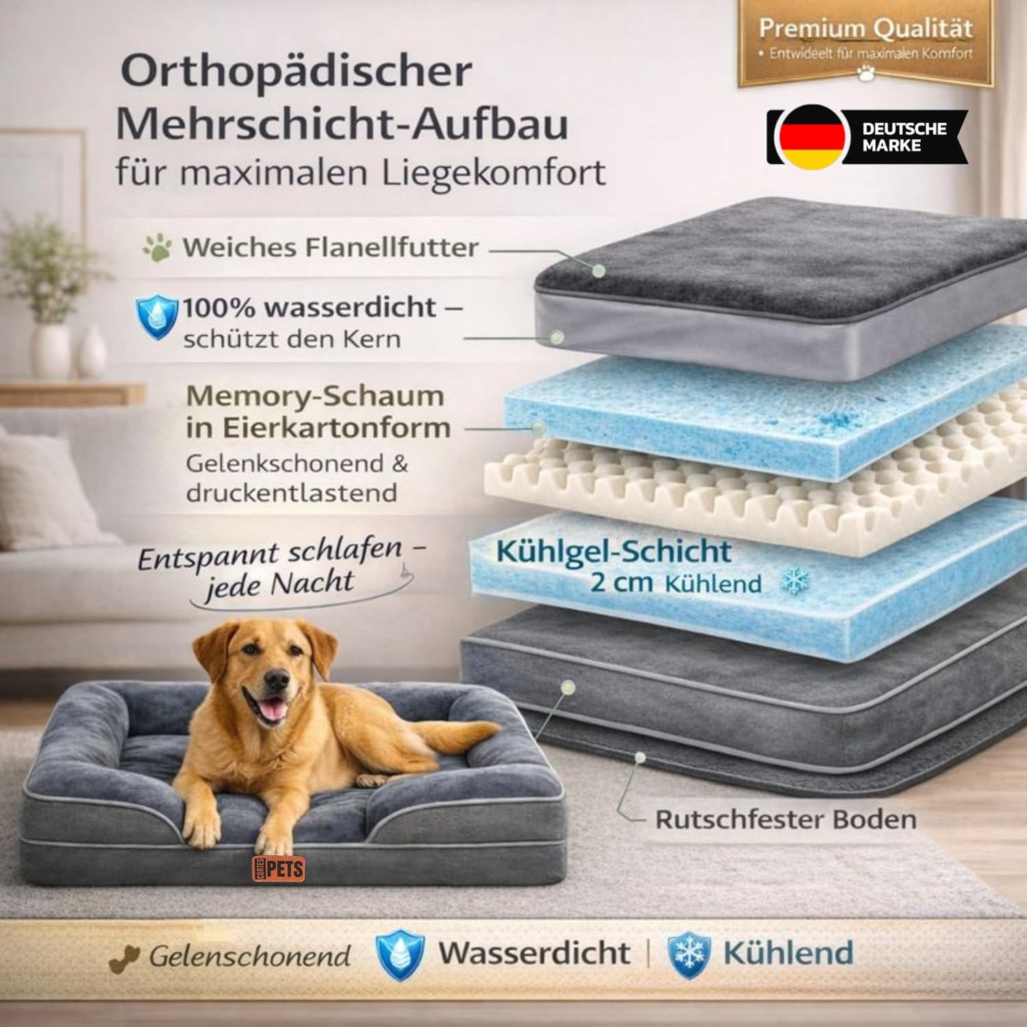 Wendbares Innenkissen mit 2 Schichten: Das Hundebett verfügt über zwei orthopädische Schaumstoffschichten: gelgefüllter Memory-Schaum zur Temperaturregulierung und Eierkarton-Stützschaum zur Druckentlastung.