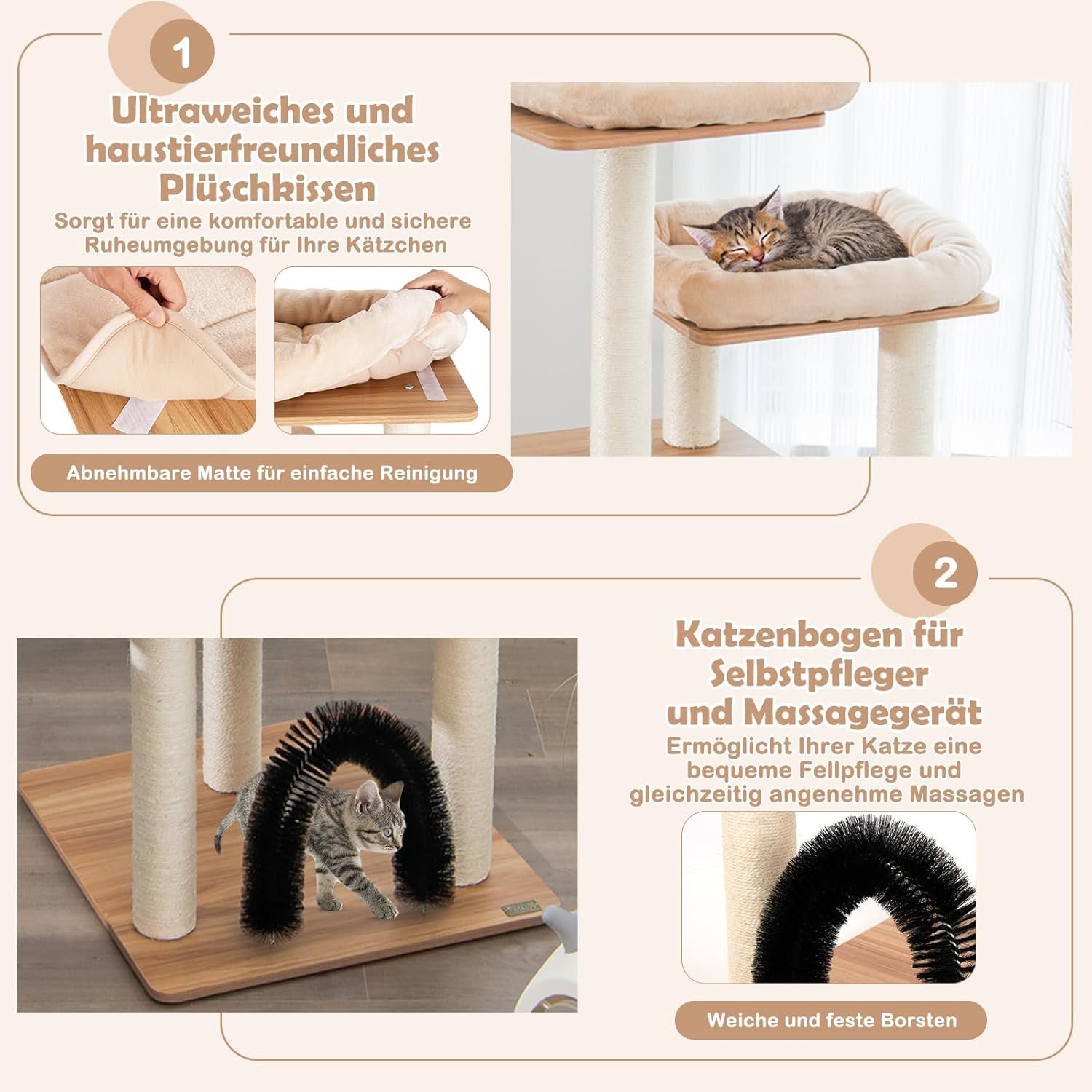 Weiches Plüschkissen und Katzenbogen: Der niedliche Kratzbaum ist mit ultraweichen und haustierfreundlichen Plüschkissen bedeckt, die Ihren Kätzchen eine komfortable und sichere Ruheumgebung bieten. Und die Kissen können für die tägliche Reinigung leicht entfernt werden. Außerdem gibt es einen Katzenbogen, der es Ihrer Katze ermöglicht, angenehme Massagen zu genießen, während sie ihr Fell putzt und pflegt.