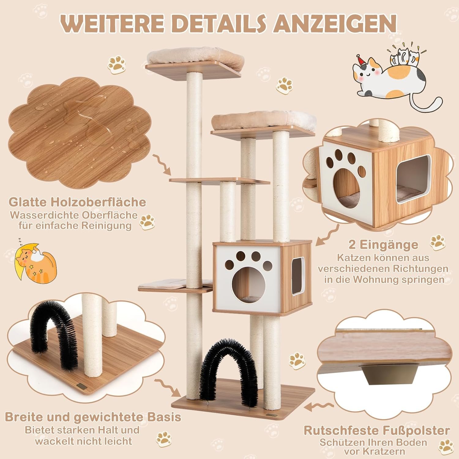 Robuste und stabile Struktur: Der Kratzbaum aus Holz mit mehreren Plattformen besteht aus hochwertigem Holzmaterial, das glatt, wasserdicht, kratzfest und langlebig ist und eine lange Lebensdauer gewährleistet. Und eine beschwerte und große Basis und verdickte Sisalpfosten sorgen für starken Halt und garantieren große Stabilität. Außerdem gibt es rutschfeste Fußpolster zum Schutz Ihres Bodens.