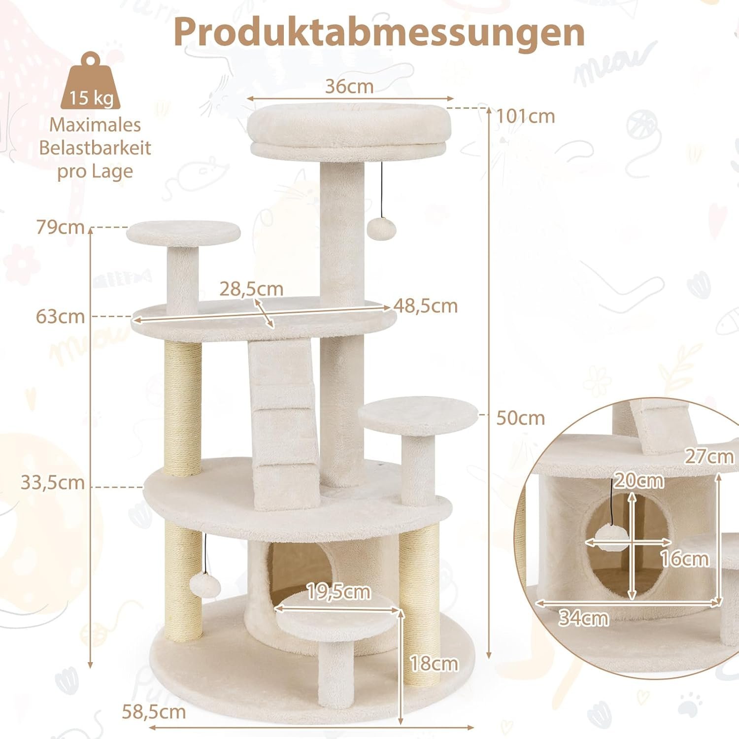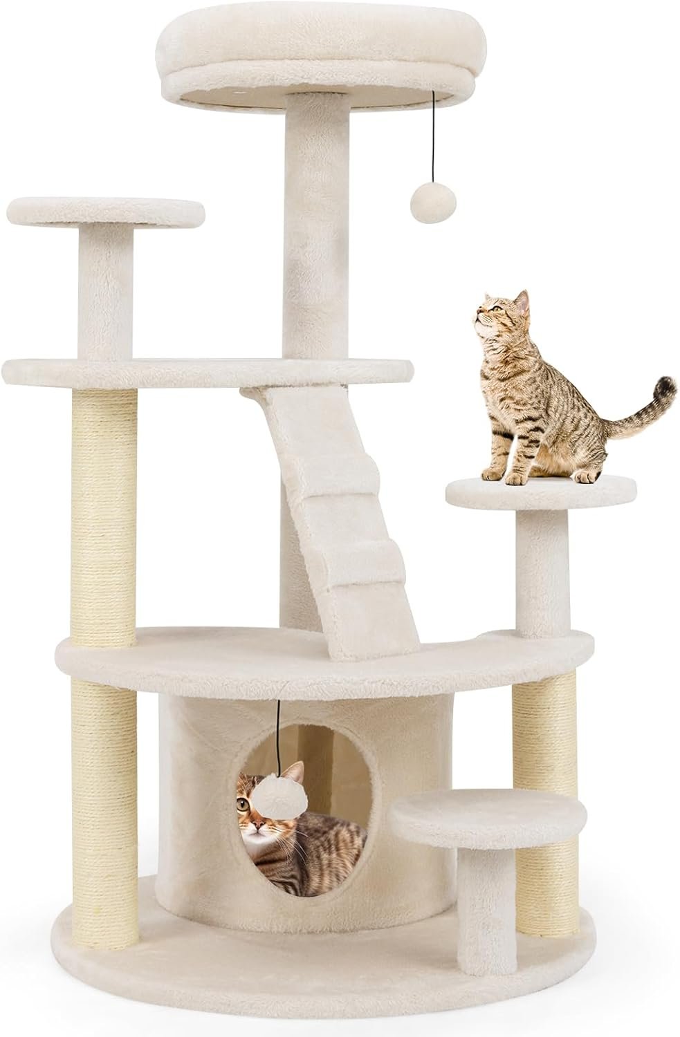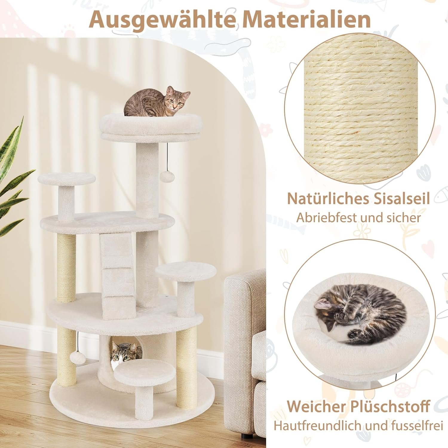 Der mehrstufige Kratzbaum ist so konzipiert, dass er alle Bedürfnisse Ihrer Katzenfreunde erfüllt. Mit einer gleichmäßig verteilten Struktur und einem angemessenen Abstand zwischen den Plattformen ist der große Kratzbaum eine freundliche Wahl für Munchkin-Katzen und ältere Katzen. Mit einer dick gepolsterten Aussichtsplattform können Ihre geliebten Katzen auf dem mehrstufigen Kratzbaum entspannen. Darüber hinaus finden Ihre Katzen in der geräumigen Höhle Komfort und Privatsphäre, während sie sich an den Sisal-Kratzbäumen erfreuen. Das hochwertige Natursisalseil ist verschleißfest und sicher. Mit weichem Plüschstoff bietet das Katzen-Aktivitätscenter Katzen erstklassigen Komfort. Hängende Plüschtiere regen zum Spielen an.