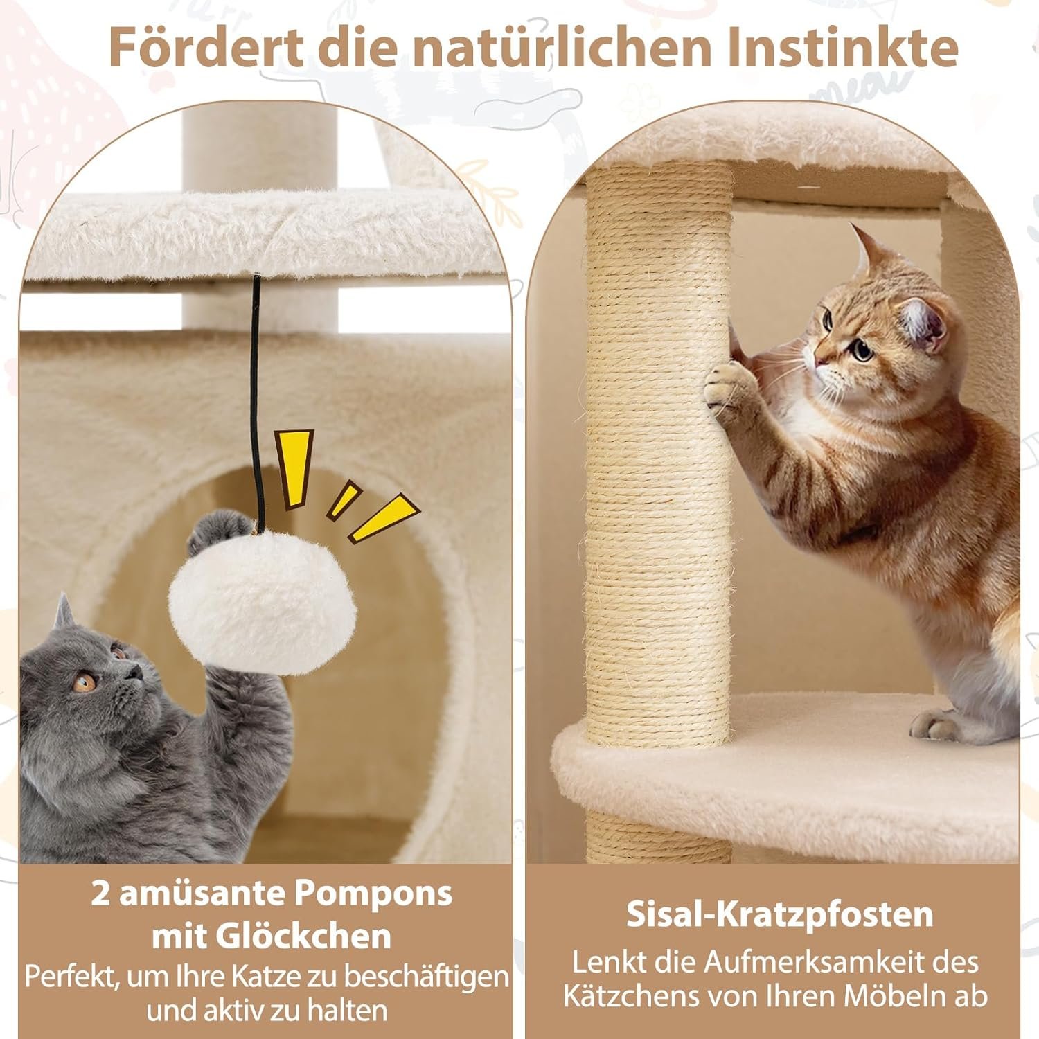 Befriedigung der natürlichen Instinkte: Der mehrstöckige Kratzbaum wird mit vollständig umwickelten Kratzbäumen geliefert, die nicht nur die instinktiven Kratzbedürfnisse Ihrer Katze erfüllen, sondern auch Ihre Möbel vor Beschädigungen schützen. Darüber hinaus ist das Hängespielzeug mit Glocke ideal, um Ihre Katze beschäftigt und aktiv zu halten.