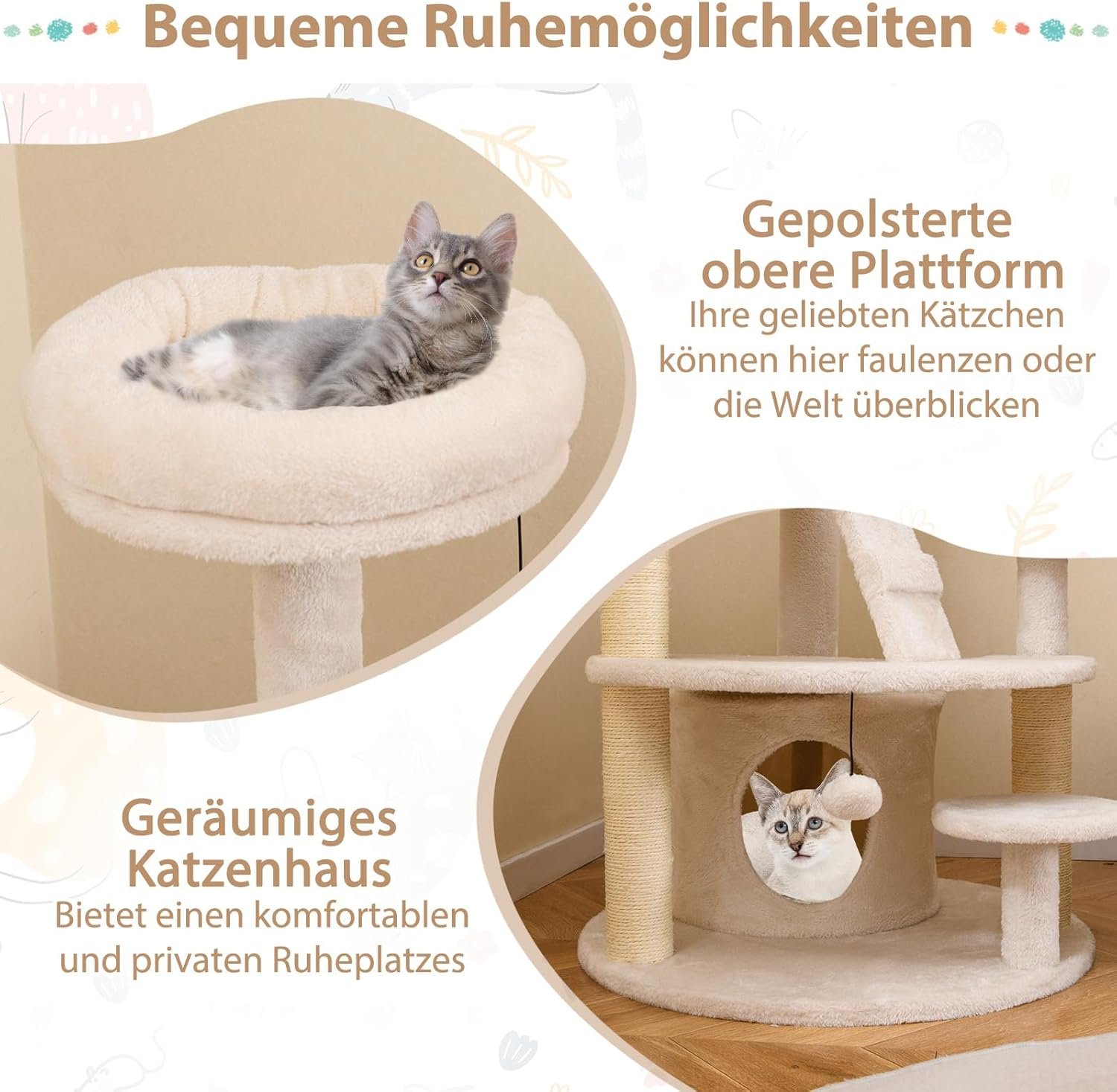 Bequeme Ruhemöglichkeiten: Der Katzenspielplatz ist mit einer ultraweich gepolsterten Sitzfläche ausgestattet, auf der sich Ihre Katze sonnen oder einfach nur die Aussicht auf die Umgebung genießen kann. Unter der Sitzfläche sorgt eine große, gemütliche Höhle für einen abgeschiedenen und privaten Schlafbereich, der einen erholsamen Schlaf unterstützt.
