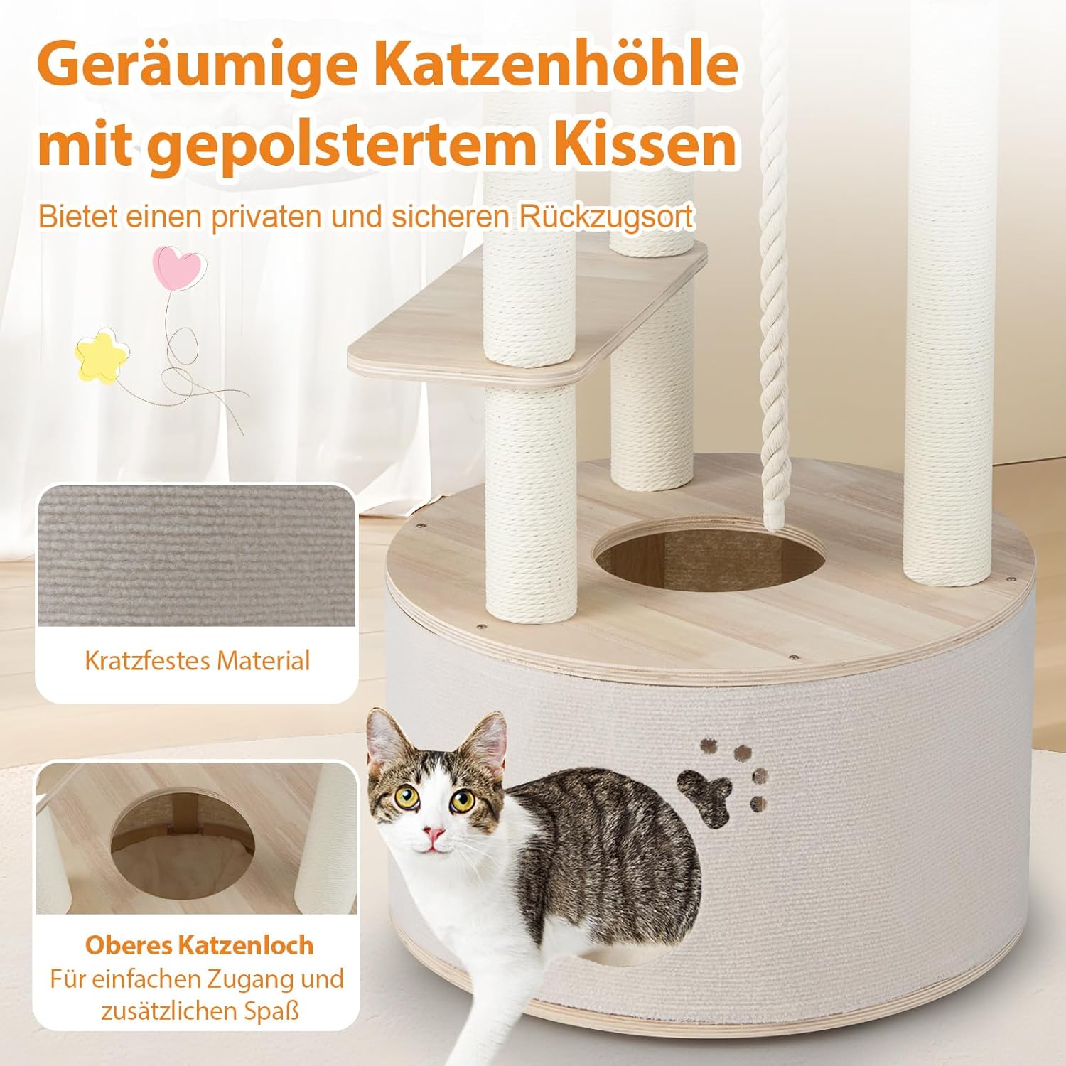 Leicht zu reinigen und einfach aufzubauen: Die gepolsterten Kissen im Katzenhaus und auf der Aussichtsplattform sind abnehmbar und waschbar, der Bezug der Katzenhöhle lässt sich ebenfalls abnehmen – das erleichtert die Reinigung erheblich. Die Installation ist dank klarer Anleitung schnell und einfach.