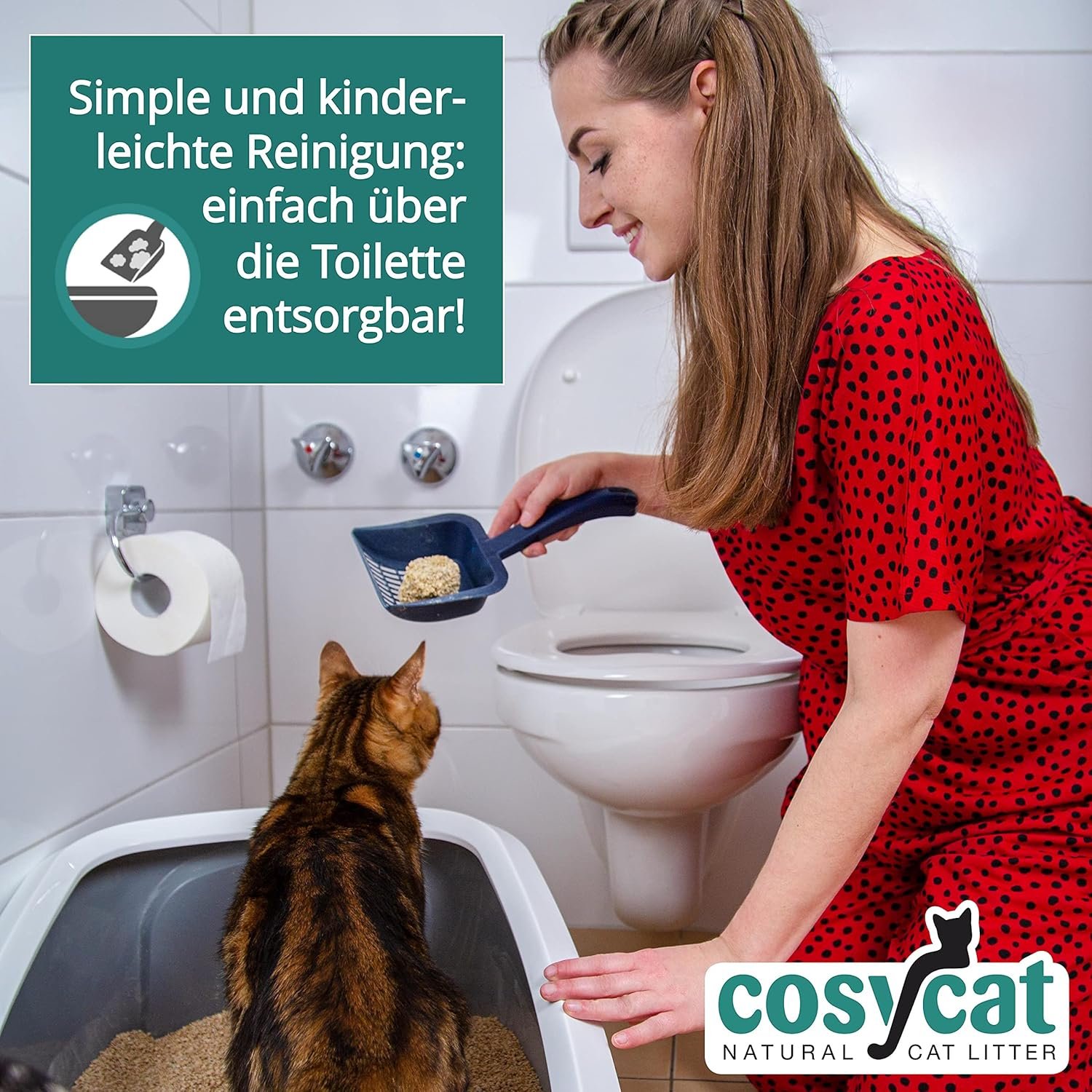 Einfach und unkompliziert: Die Reinigung der Katzentoilette mit Cosycat erfolgt schnell und einfach über der Toilette (kurz einwirken lassen und dann ausspülen)