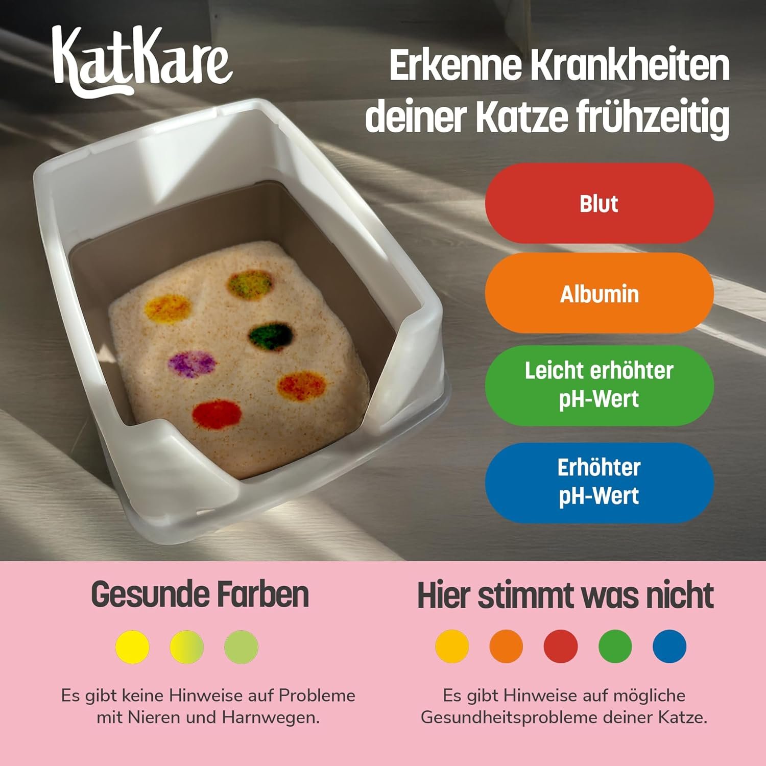 Gesundheitsindikator: Verfärbungen in der Streu zeigen frühzeitig an, wie gesund Ihre Katze ist, und sorgen so für zusätzliche Sicherheit. Frühwarnsystem: Die Streuverfärbung erkennt sofort, wenn Ihrer Fellnase etwas fehlt – so können Sie schnell handeln.