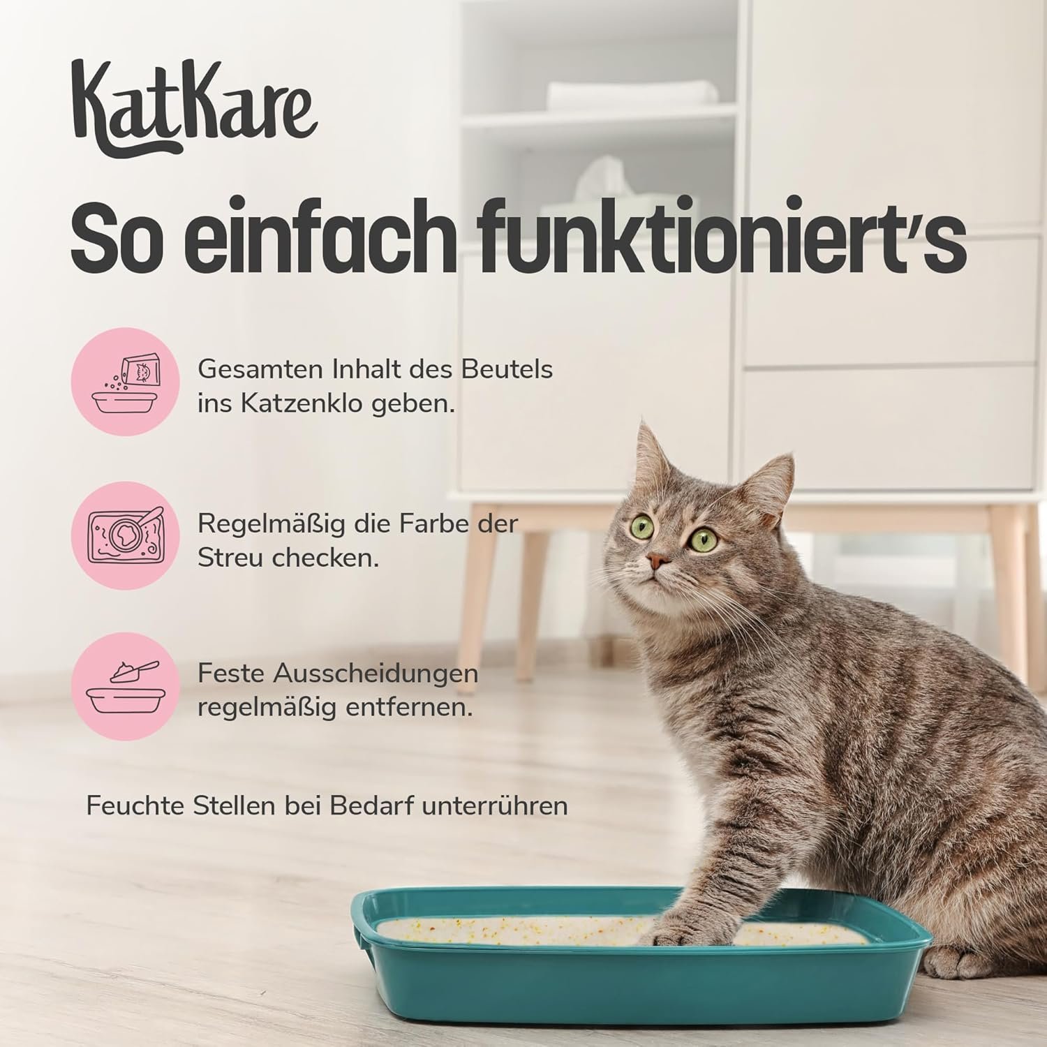 Keine Klumpen, einfache Anwendung: Die Streu verklumpt nicht – einfach den Inhalt des Beutels in die Katzentoilette geben und bei Bedarf feuchte Stellen umrühren. Feste Niederschläge regelmäßig entfernen und auf Verfärbungen prüfen – es bleibt sauber