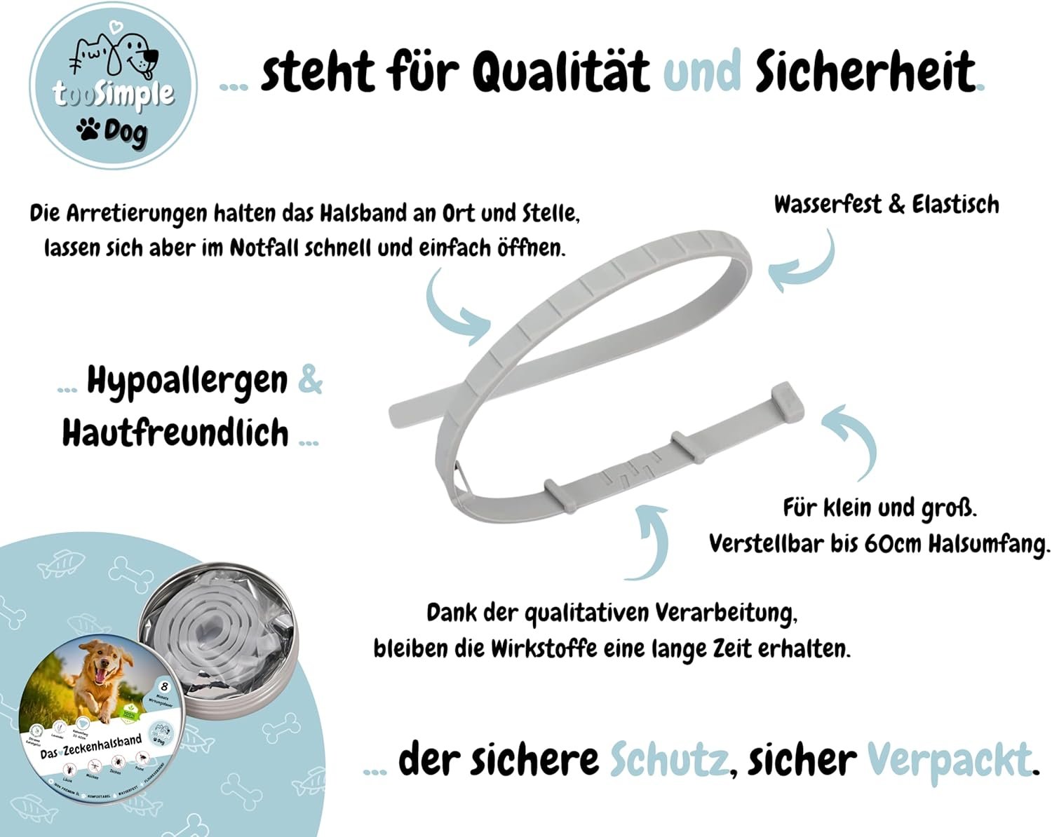 Bequeme Passform – Unser Zeckenhalsband ist für Klein und Groß geeignet. Es lässt sich leicht anlegen, verstellen und ist bis zu einem Halsumfang von 60 cm verwendbar.