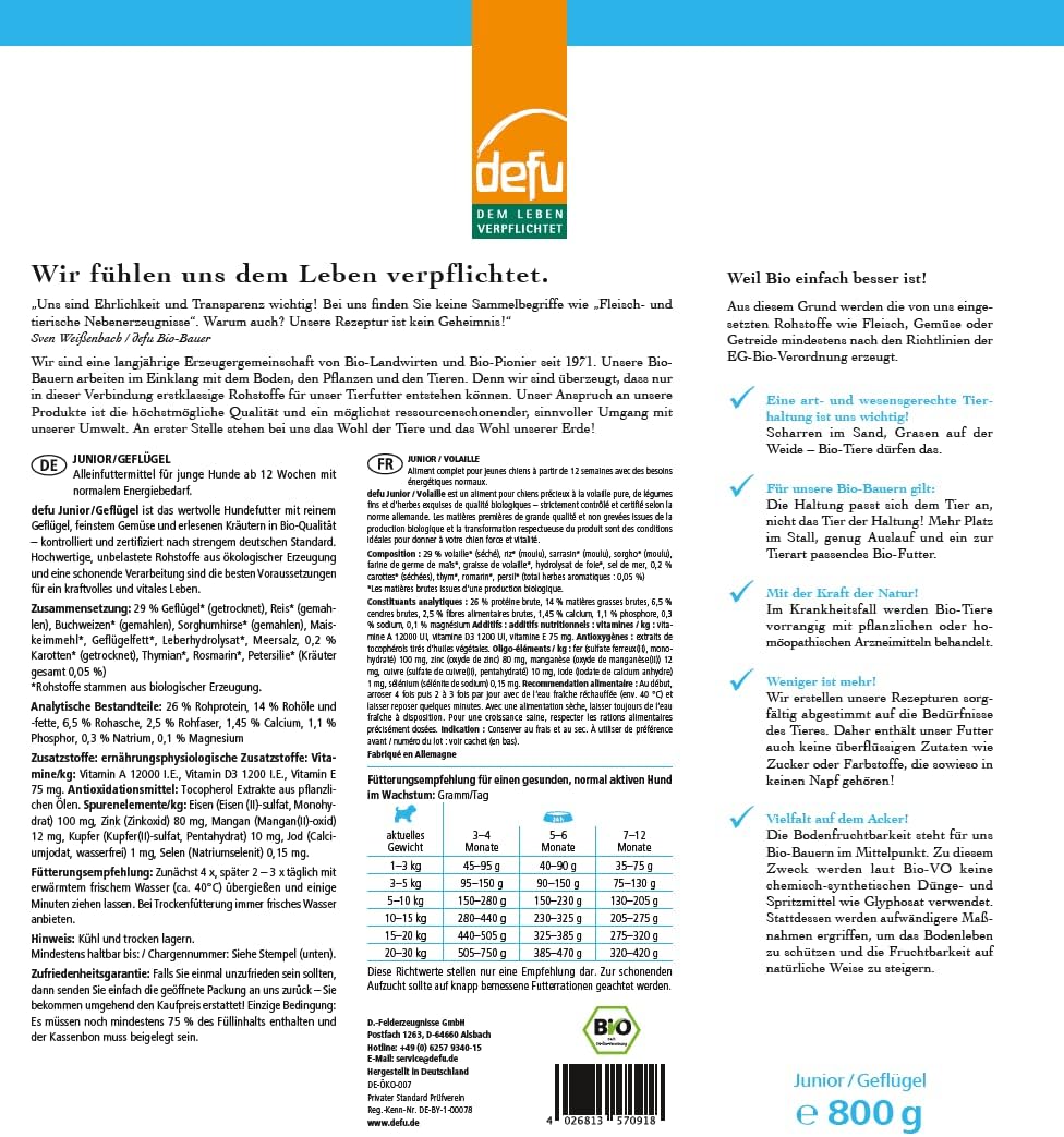Wert: defu Dog Junior Bio-Geflügel – Premium-Bio-Trockenfutter für junge Hunde Unser defu Bio-Premium-Trockenfutter „Junior Bio-Geflügel“ ist eine ausgewogene Mischung aus Bio-Geflügel, bekömmlichem Reis, vitaminreichen Karotten und wohltuenden Kräutern aus biologischem Anbau, wie Rosmarin, Petersilie und Thymian. Wertvolle Sorghumhirse und Buchweizen werden aufgrund ihrer zahlreichen Vitamine und Spurenelemente sowie als pflanzlicher Proteinlieferant in der Ernährung sehr geschätzt und sind von Natur aus glutenfrei. Das „Junior Bio-Geflügel“ ist ein Alleinfuttermittel, das sorgfältig auf die Bedürfnisse junger Hunde im Wachstum abgestimmt ist. Der hohe Protein- und Mineralstoffgehalt unterstützt den Aufbau von Knochen, Muskeln und Organen. Ideal für einen guten und gesunden Start ins Leben an Ihrer Seite. Die von uns verwendeten Rohstoffe stammen aus kontrolliert biologischem Anbau und werden möglichst schonend verarbeitet. Zusammensetzung: 29 % Geflügel* (getrocknet), Reis* (gemahlen), Buchweizen* (gemahlen), Sorghumhirse* (gemahlen), Maiskeimmehl*, Geflügelfett*, Leberhydrolisat aus Geflügelleber*, Meersalz, 0,2 % Karotten* (getrocknet), Thymian*, Rosmarin*, Petersilie. I* (HerHereeTotal 0,05 %). Die Rohstoffe stammen aus biologischem Anbau. Analytische Bestandteile: 26 % Rohprotein, 14 % Rohöle und -fette, 6,5 % Rohasche, 2,5 % Rohfaser, 1,45 % Calcium, 1,1 % Phosphor, 0,3 % Natrium, 0,1 % Magnesium.