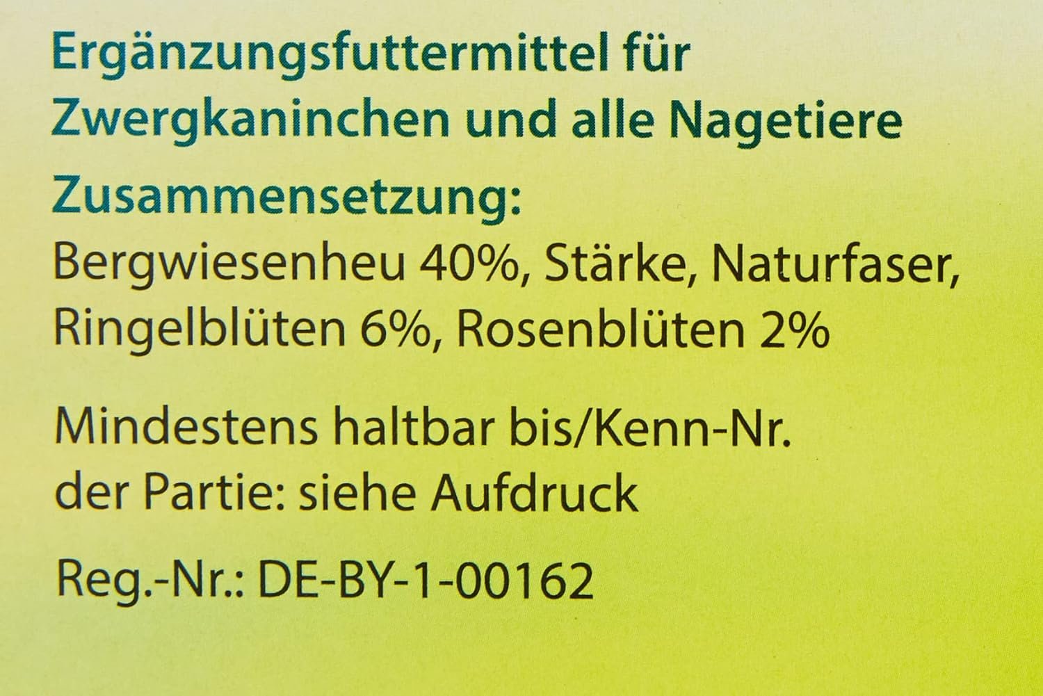 Zusammensetzung: 40 % Bergwiesenheu, Stärke, Naturfaser, 6 % Ringelblumenblüten, 2 % Rosenblütenblätter