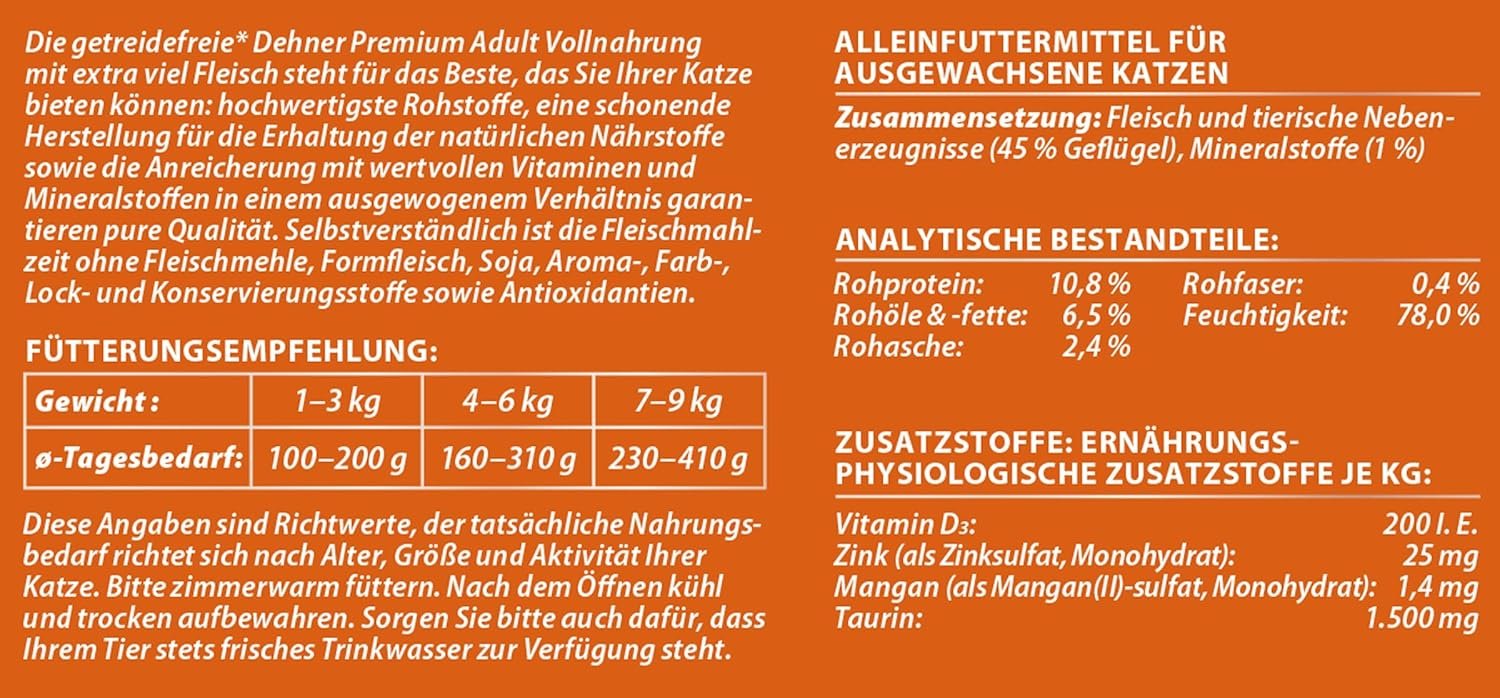Das getreidefreie Katzennassfutter Dehner Premium Adult mit ausgewählten Rohstoffen wird in einem speziellen Verfahren mit extra viel Fleisch hergestellt. Damit bei der Herstellung dieses hochwertigen Futters für ausgewachsene Katzen keine wertvollen Vitamine, Mineralien und Spurenelemente verloren gehen, wird es besonders schonend gekocht und kalt abgefüllt. Eine köstliche Fleischmahlzeit für Ihre Katze in Premiumqualität. Alles, was einer ausgewogenen Ernährung abträglich ist, finden Sie bei Dehner Premium Adult garantiert nicht. Deshalb verzichten wir konsequent auf Konservierungs-, Aroma-, Farb- und Lockstoffe, Fleischmehle, Formfleisch, Soja und Antioxidantien.