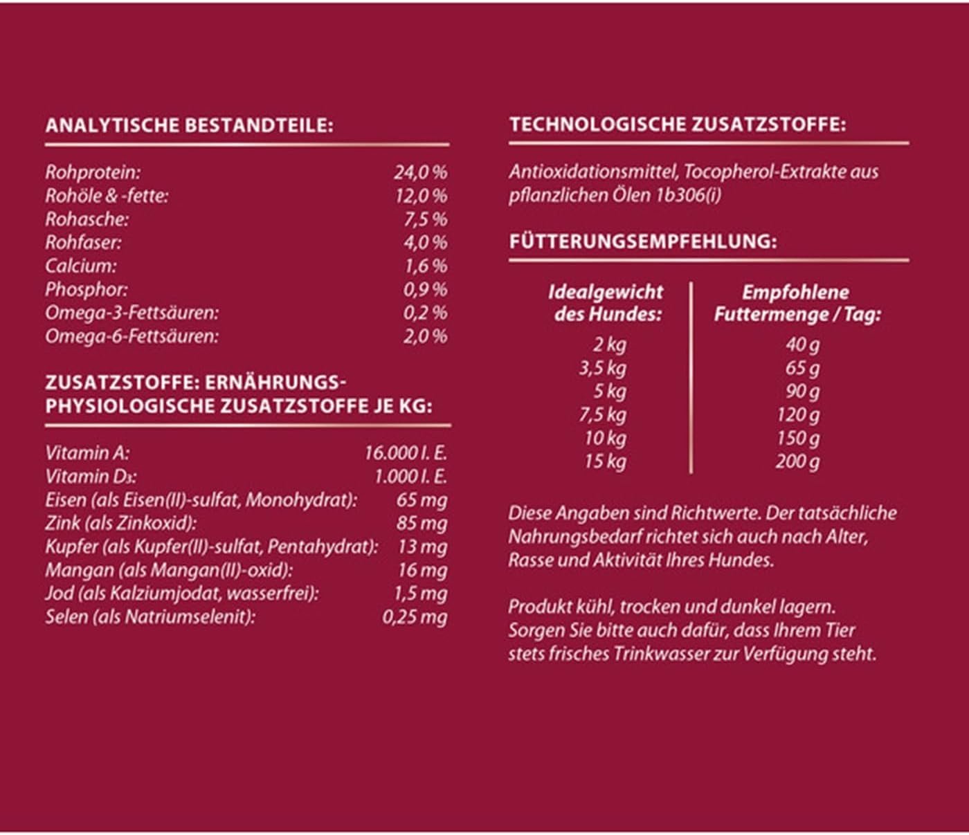 Diese Informationen sind Richtwerte. Der tatsächliche Futterbedarf hängt vom Alter, der Größe und der Aktivität Ihres Hundes ab. Nach dem Öffnen kühl und trocken lagern. Bitte stellen Sie außerdem sicher, dass Ihr Haustier immer frisches Trinkwasser hat.