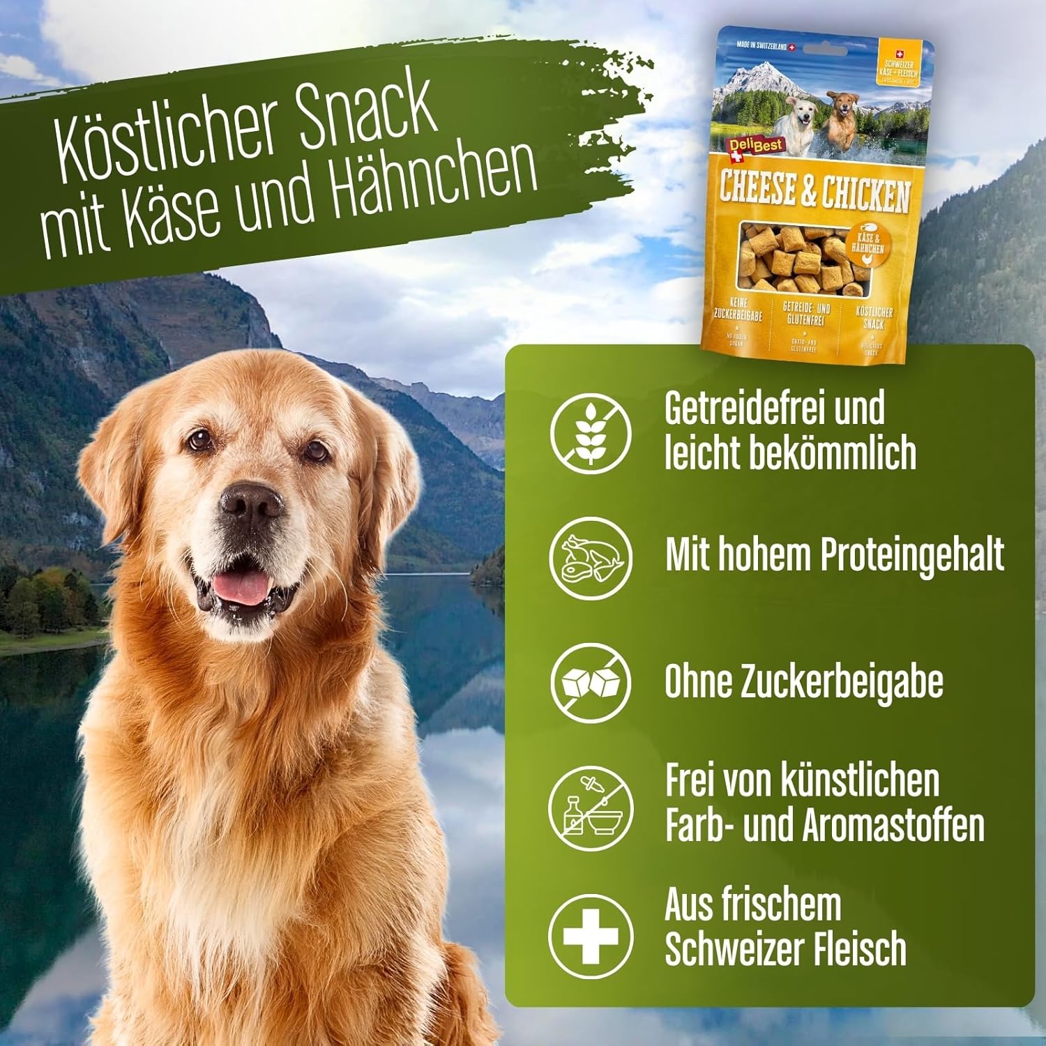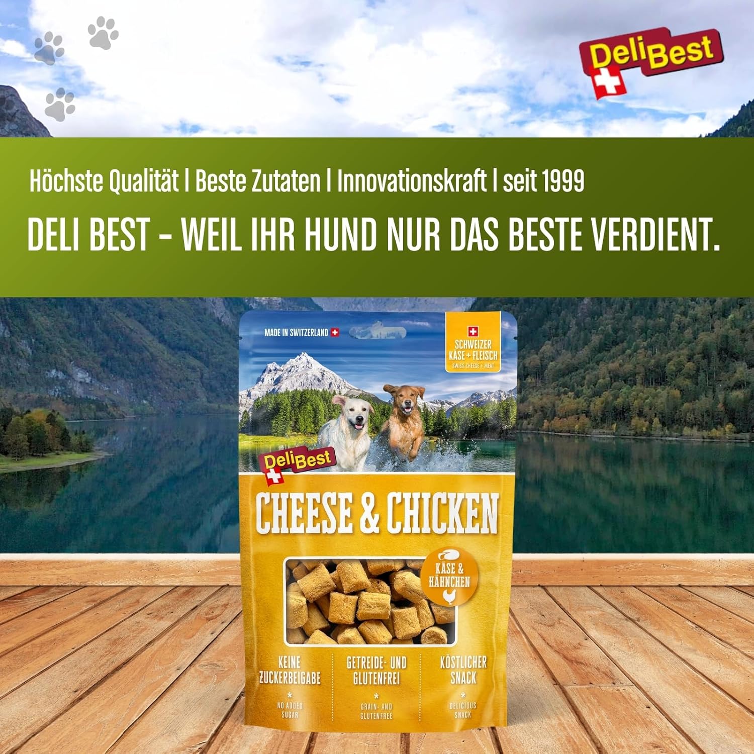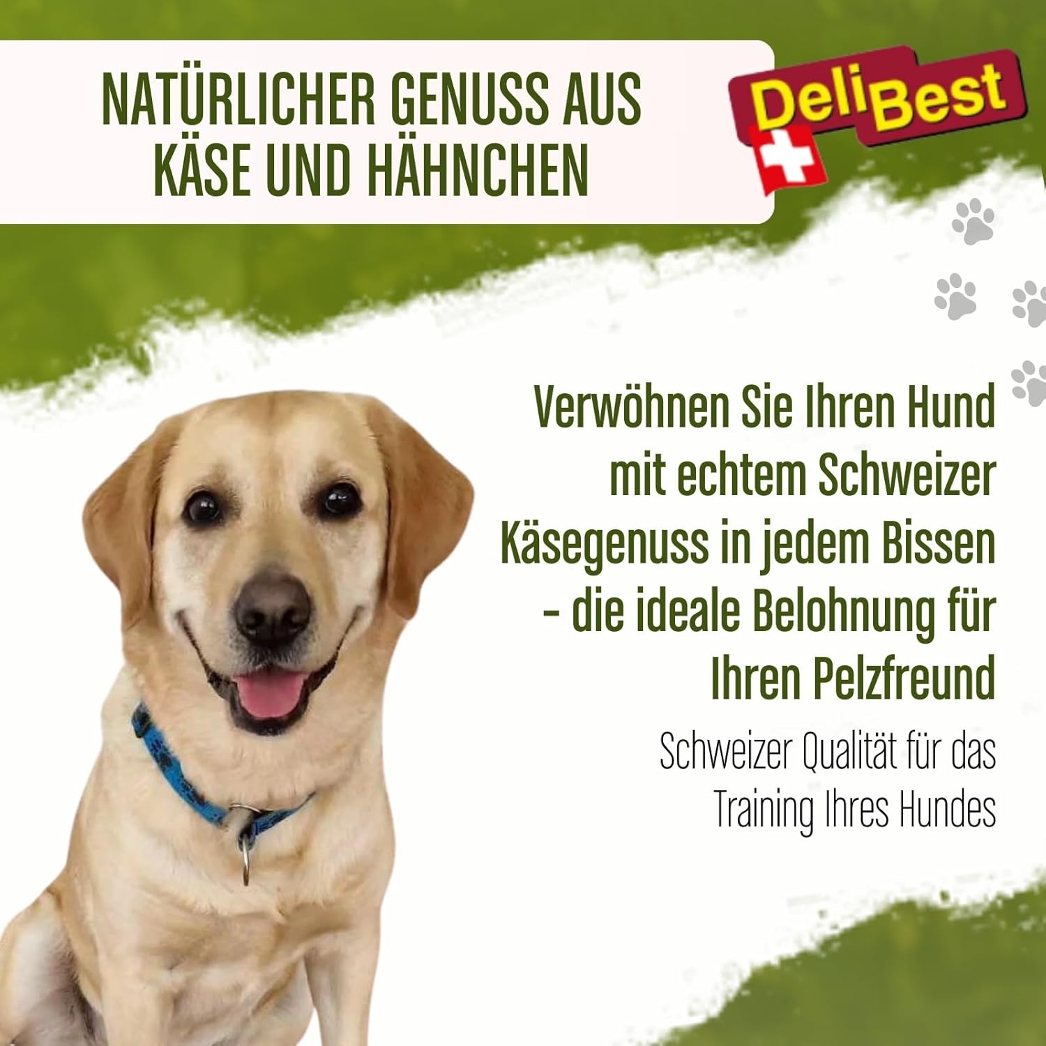 DeliBest Dog behandelt Käse und Hühnchen. Das leckere Futter als Hundesnack für zwischendurch. Der Hundesnack erfreut kleine und große Hunde und eignet sich daher ideal für das Training oder die Hundeerziehung. Die Hundesnacks erfüllen die gesetzten Ziele wie hohe Akzeptanz bei den Vierbeinern und eine sinnvolle Kaubeschäftigung. Die Käse- und Hähnchensnacks sind auch für Lebensmittelallergiker geeignet, da bei der Herstellung komplett auf Getreide verzichtet wird und die Leckereien somit glutenfrei sind. DeliBest-Produkte sind 100 % natürlich, es werden keine chemischen Zusätze verwendet. Die Rohstoffe stammen von Qualitätsbetrieben, die die relevanten gesetzlichen Vorschriften hinsichtlich Rückstände, Medikamente, Myotoxine und Hormone einhalten. Die Vorteile auf einen Blick: Ergänzungsfuttermittel, 100 % natürlich, ohne chemische Zusätze, von Qualitätsunternehmen, kaltgepresster Snack mit 77 % Fleischanteil und verfeinert mit Schweizer Käse, glutenfrei, Trainingssnacks, Fütterungsempfehlung: Das Alleinfutter Ihres Hundes sollte entsprechend reduziert werden. Sorgen Sie stets für ausreichend frisches Wasser. Zusammensetzung: 77 % Schweizer Hühnerfleisch, Kartoffeln, pflanzliche Nebenerzeugnisse, Mineralstoffe. Analytische Inhaltsstoffe. 30,5 % Rohprotein, 19 % Rohfette, 4,8 % Rohasche, 11,2 % Rohfaser, 20,0 % Feuchtigkeit. DeliBest – die gesunde Wahl für Tiernahrung für Ihren Vierbeiner. Mit unseren Artikeln bieten wir Ihnen ein vollwertiges Vollsortiment mit einer großen Auswahl an Nass- und Halbnassfutter, Kausnacks, Snacks und Nahrungsergänzungsmitteln für Haustiere. „Swiss Quality“ steht bei uns im Mittelpunkt. Wir legen großen Wert auf viel frisches Fleisch und nur hochwertige Zutaten. In unseren Produkten verzichten wir zudem auf unnötige Streckmittel und Fleischmehle. Denn unsere Fellnasen verdienen nur das Beste!