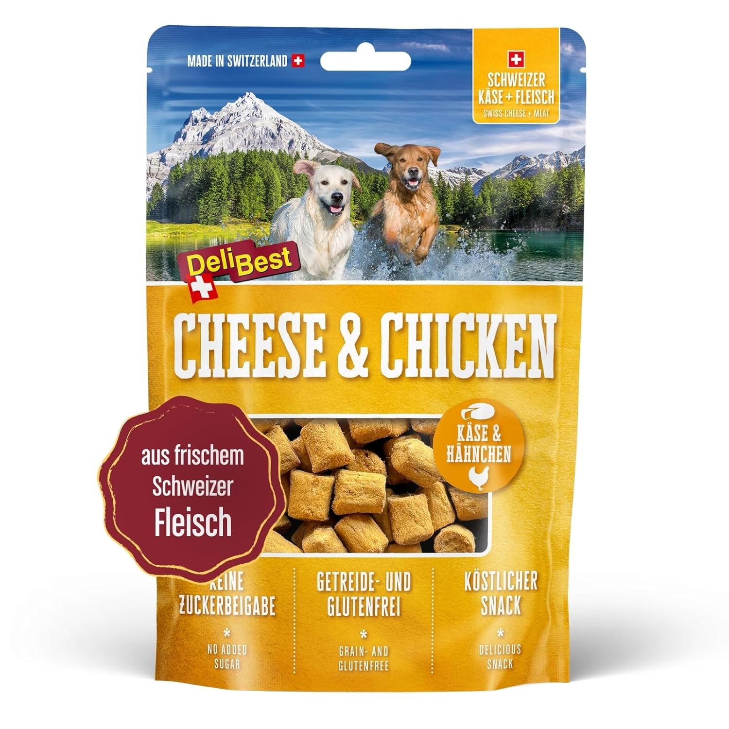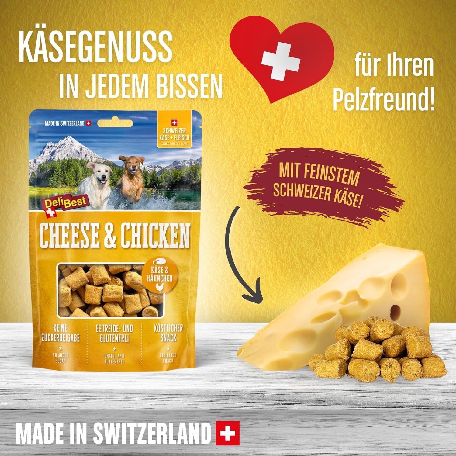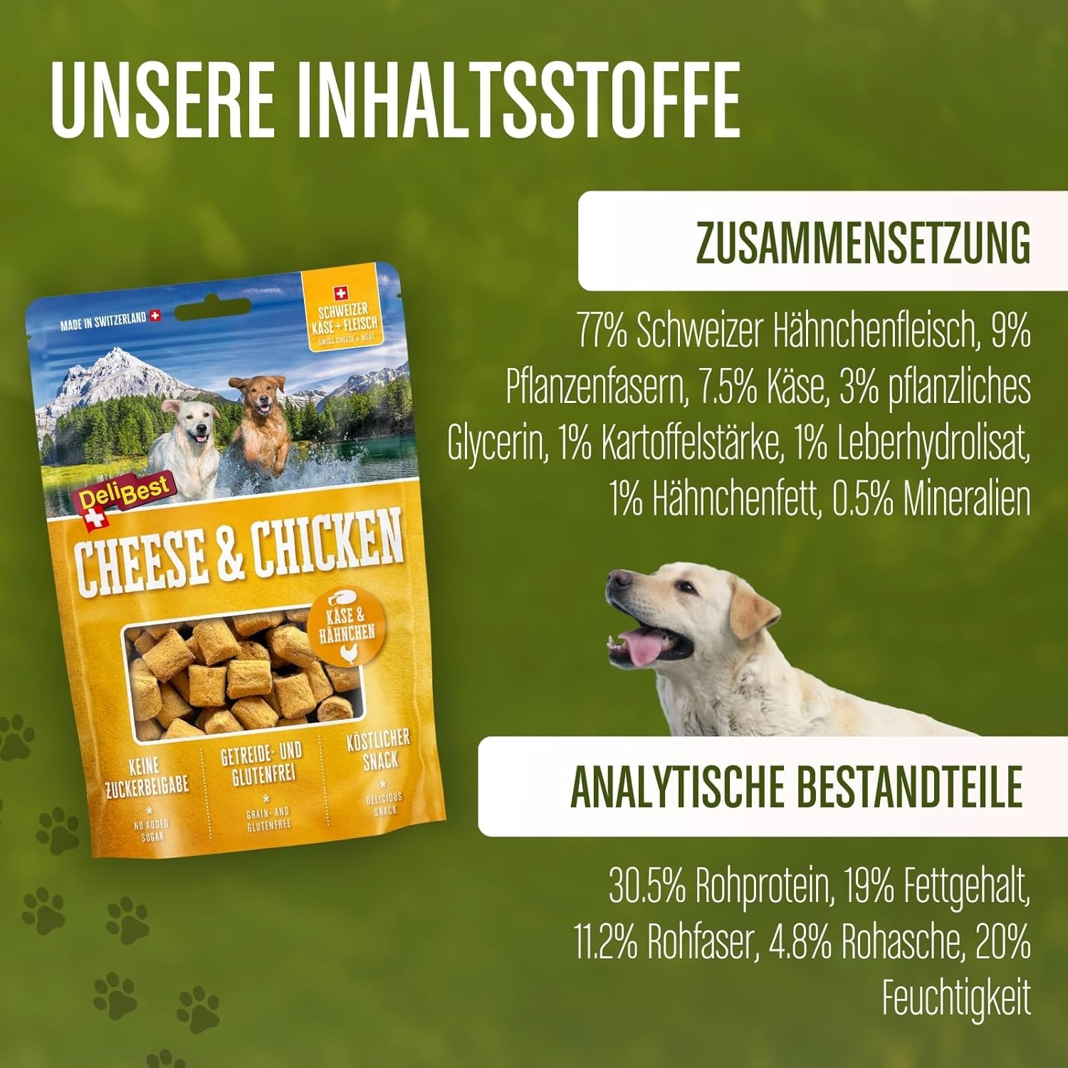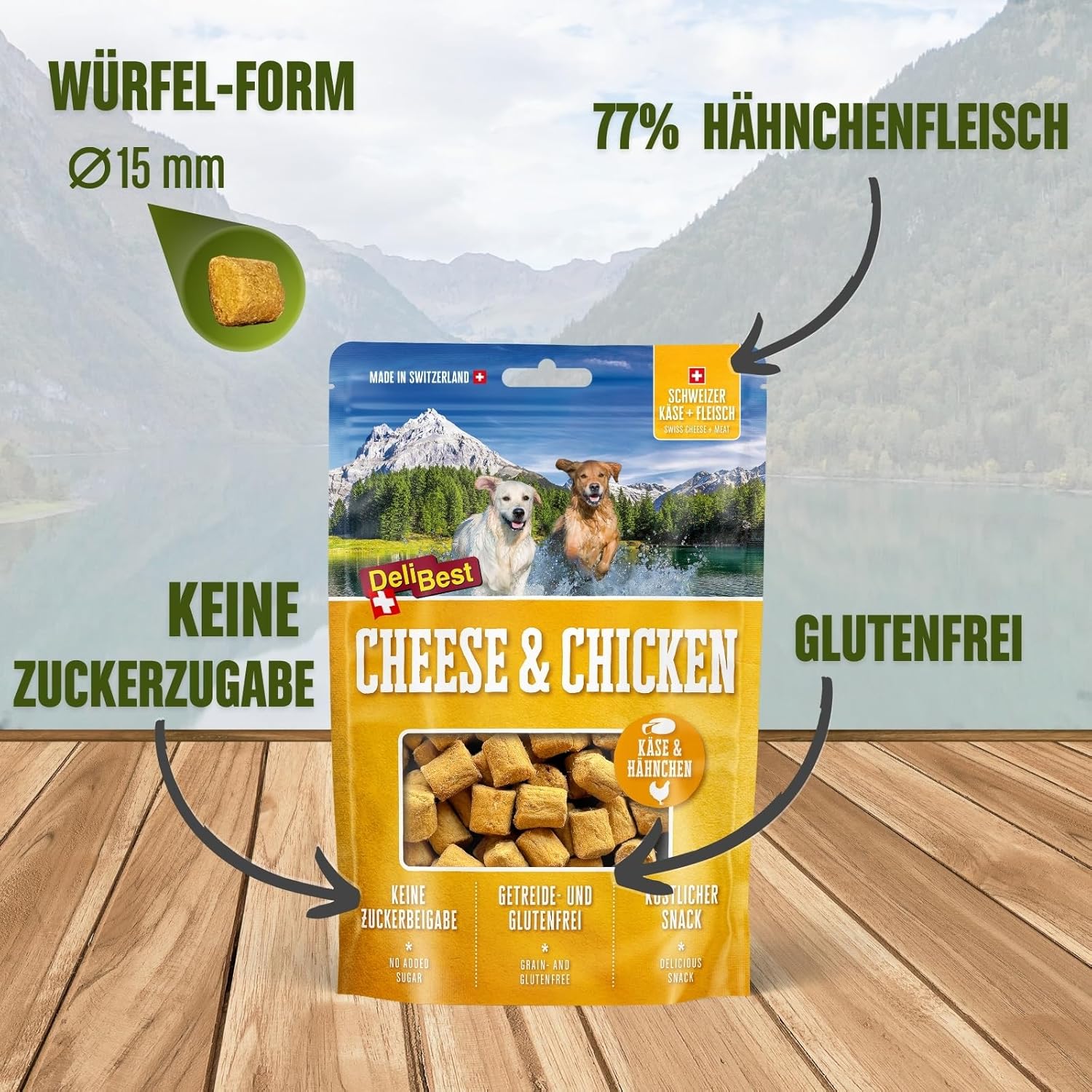 DeliBest Dog behandelt Käse und Hühnchen. Das leckere Futter als Hundesnack für zwischendurch. Der Hundesnack erfreut kleine und große Hunde und eignet sich daher ideal für das Training oder die Hundeerziehung. Die Hundesnacks erfüllen die gesetzten Ziele wie hohe Akzeptanz bei den Vierbeinern und eine sinnvolle Kaubeschäftigung. Die Käse- und Hähnchensnacks sind auch für Lebensmittelallergiker geeignet, da bei der Herstellung komplett auf Getreide verzichtet wird und die Leckereien somit glutenfrei sind. DeliBest-Produkte sind 100 % natürlich, es werden keine chemischen Zusätze verwendet. Die Rohstoffe stammen von Qualitätsbetrieben, die die relevanten gesetzlichen Vorschriften hinsichtlich Rückstände, Medikamente, Myotoxine und Hormone einhalten. Die Vorteile auf einen Blick: Ergänzungsfuttermittel, 100 % natürlich, ohne chemische Zusätze, von Qualitätsunternehmen, kaltgepresster Snack mit 77 % Fleischanteil und verfeinert mit Schweizer Käse, glutenfrei, Trainingssnacks, Fütterungsempfehlung: Das Alleinfutter Ihres Hundes sollte entsprechend reduziert werden. Sorgen Sie stets für ausreichend frisches Wasser. Zusammensetzung: 77 % Schweizer Hühnerfleisch, Kartoffeln, pflanzliche Nebenerzeugnisse, Mineralstoffe. Analytische Inhaltsstoffe. 30,5 % Rohprotein, 19 % Rohfette, 4,8 % Rohasche, 11,2 % Rohfaser, 20,0 % Feuchtigkeit. DeliBest – die gesunde Wahl für Tiernahrung für Ihren Vierbeiner. Mit unseren Artikeln bieten wir Ihnen ein vollwertiges Vollsortiment mit einer großen Auswahl an Nass- und Halbnassfutter, Kausnacks, Snacks und Nahrungsergänzungsmitteln für Haustiere. „Swiss Quality“ steht bei uns im Mittelpunkt. Wir legen großen Wert auf viel frisches Fleisch und nur hochwertige Zutaten. In unseren Produkten verzichten wir zudem auf unnötige Streckmittel und Fleischmehle. Denn unsere Fellnasen verdienen nur das Beste!