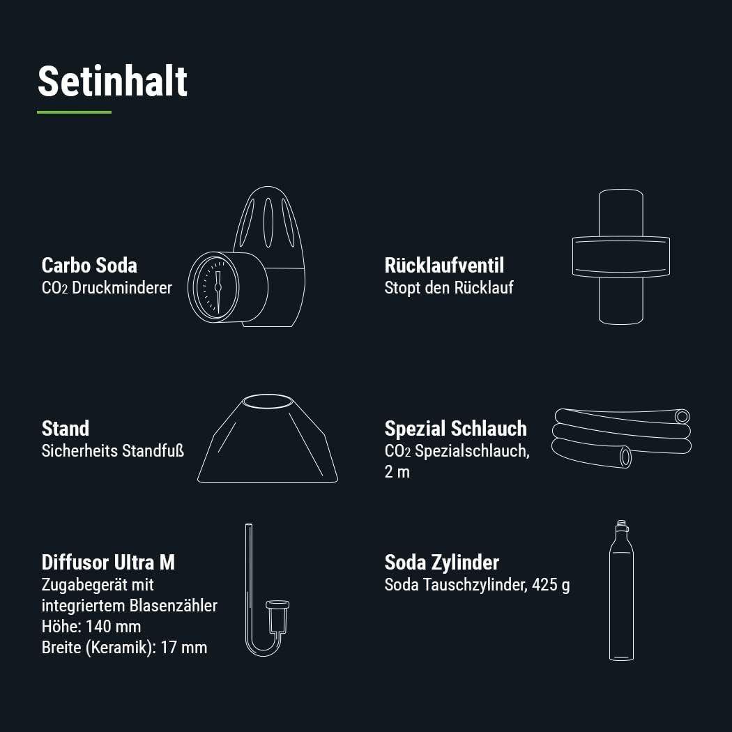 Lieferumfang: Carbo Soda – Präzisions-Druckregler, CO2-Diffusor, CO2-Umkehrschutz, Soda-CO2-Zylinder, Basis für CO2-Zylinder, CO2-Spezialschlauch