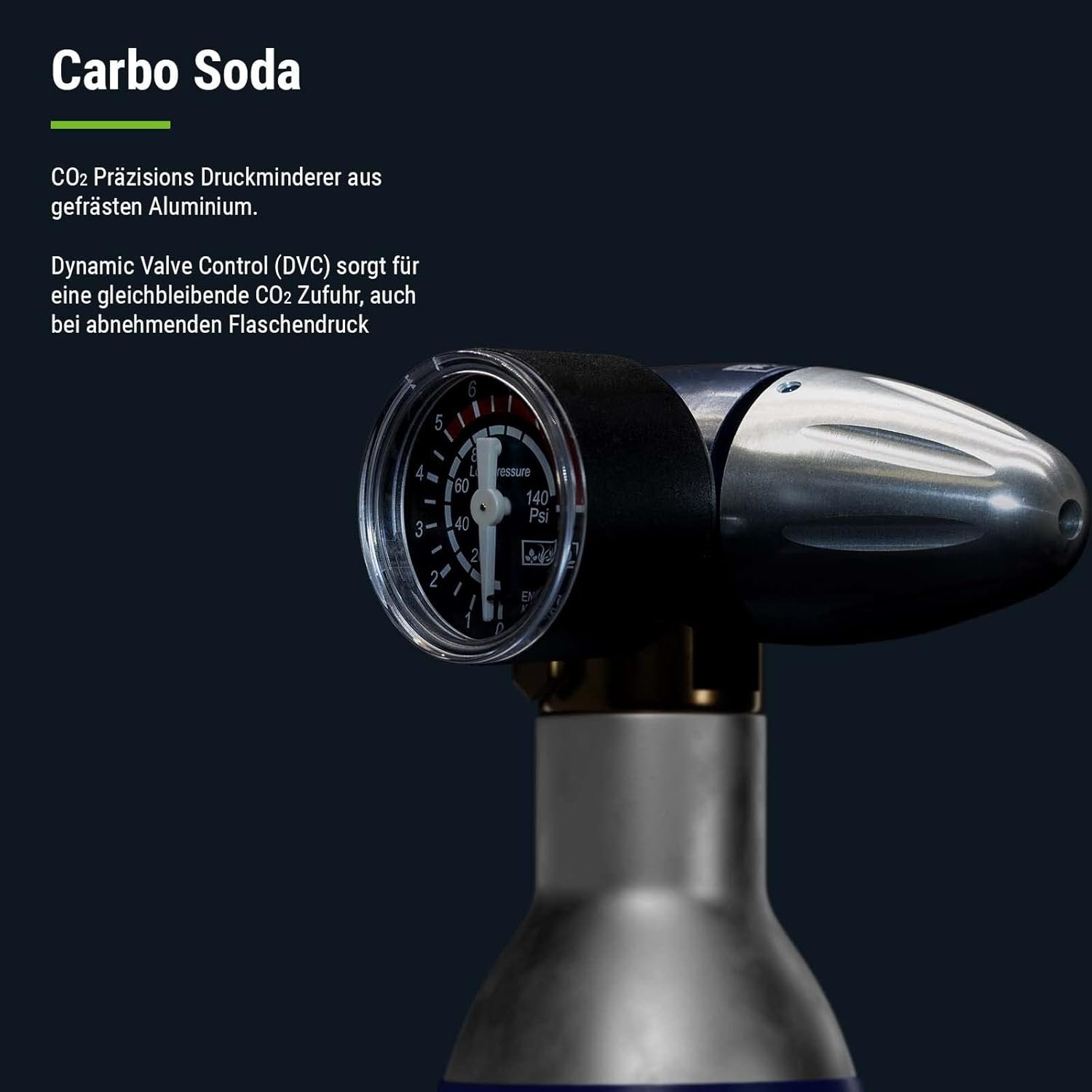 CO2-Druckminderer Carbo Soda aus gefrästem Aluminium mit dynamischer Ventilsteuerung für eine konstante CO2-Versorgung