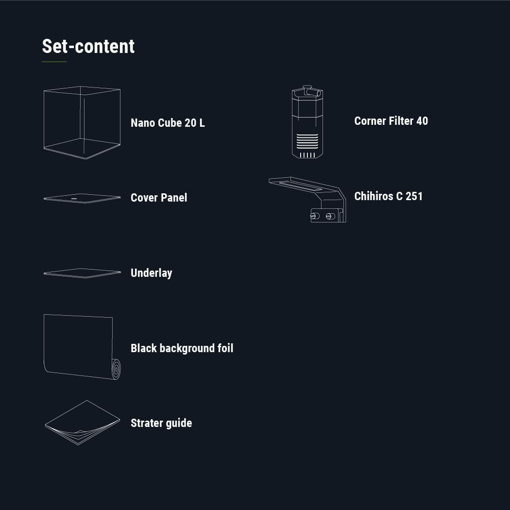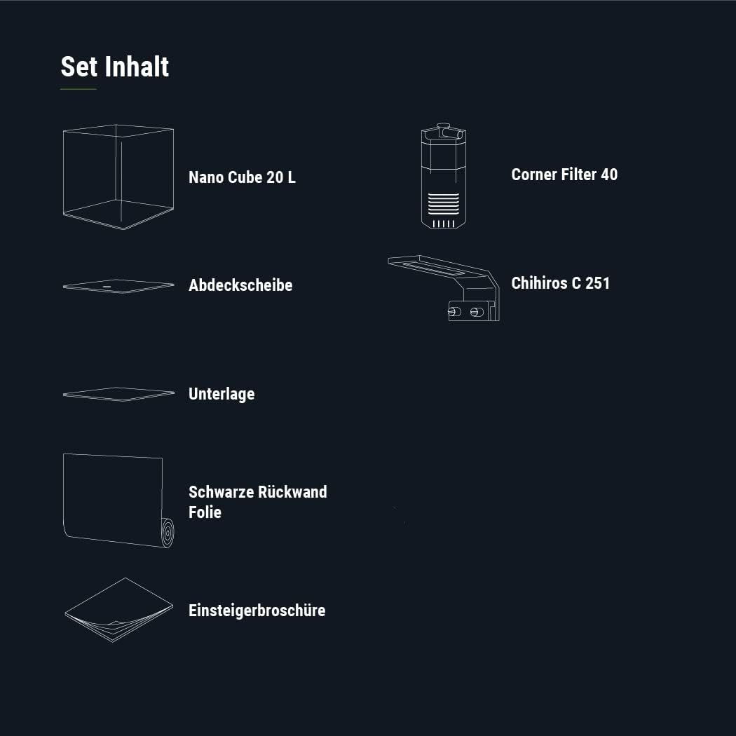 Inhalt: Chihiros C-Serie, Eckfilter, Abdeckscheibe mit Fingerloch – inkl. Halterung, wärmeisolierendes Sicherheitspolster, Rückwandfolie, Starterheft