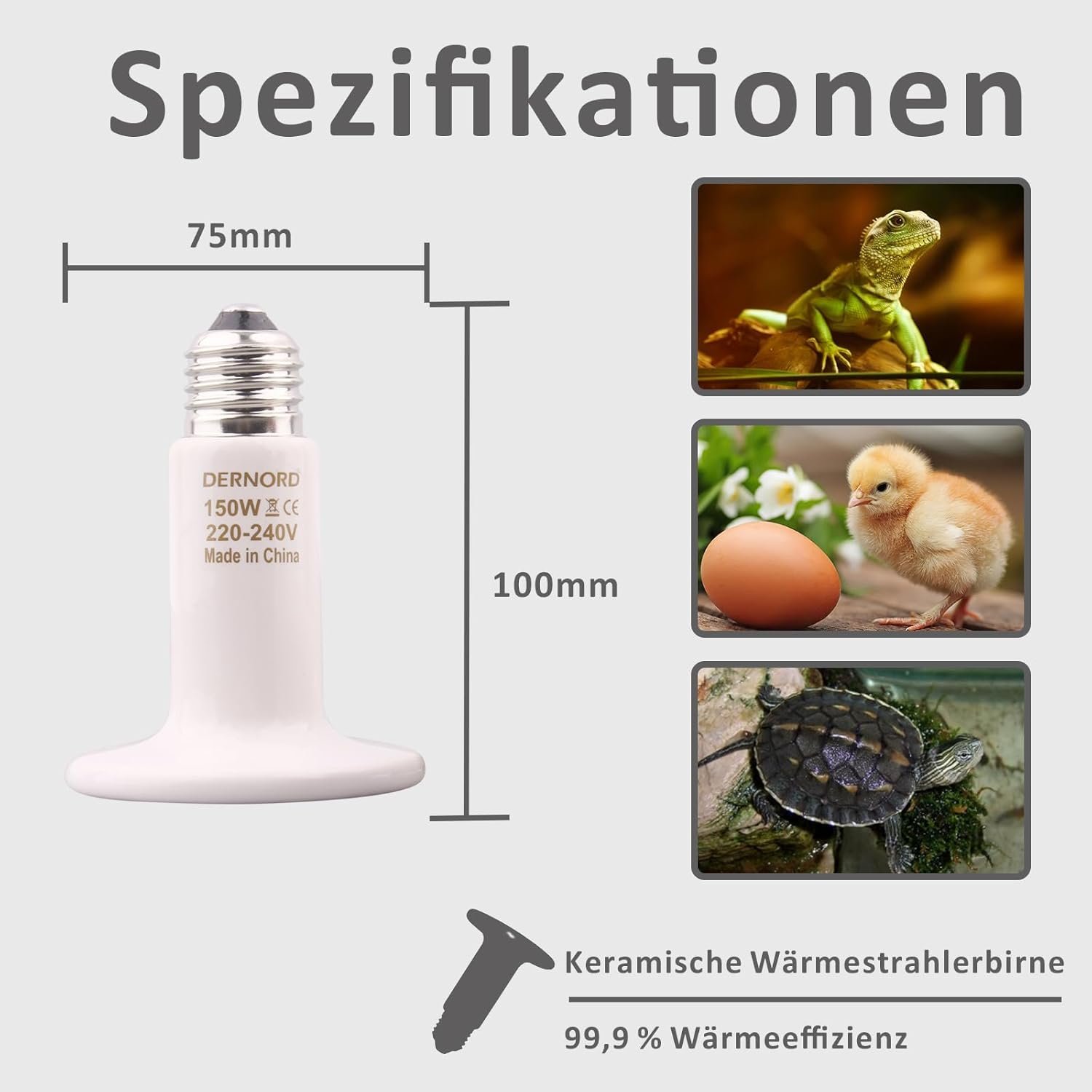 Langlebiges und sicheres Design: Diese Keramik-Wärmelampe besteht aus hochwertiger Keramik und ist stabiler und langlebiger als herkömmliche Heizlampen. Sie ist mit der Keramikfassung E27 kompatibel und arbeitet mit 230 Volt für eine einfache Installation. Achten Sie auf die Sicherheit, indem Sie einen Abstand von mindestens 30 cm zu den Tieren einhalten und häufiges Ein- und Ausschalten vermeiden