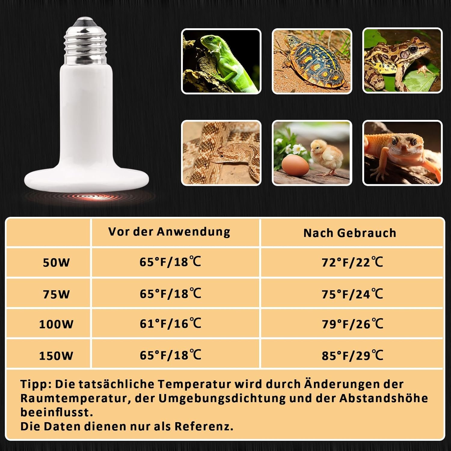 Sicherheit und Gebrauchsanweisung: Für optimale Sicherheit verwenden Sie diesen dunklen Strahler e27 mit hochwertigen Keramikfassungen. Vermeiden Sie die Platzierung in der Nähe von brennbaren Gegenständen wie Vorhängen oder in Holzkäfigen. Befestigen Sie die Lampe immer oben an Ihrem Terrarium oder verwenden Sie einen Reptilienlampenständer. Befolgen Sie diese Richtlinien, um Ihren Tieren einen sicheren und warmen Lebensraum zu bieten