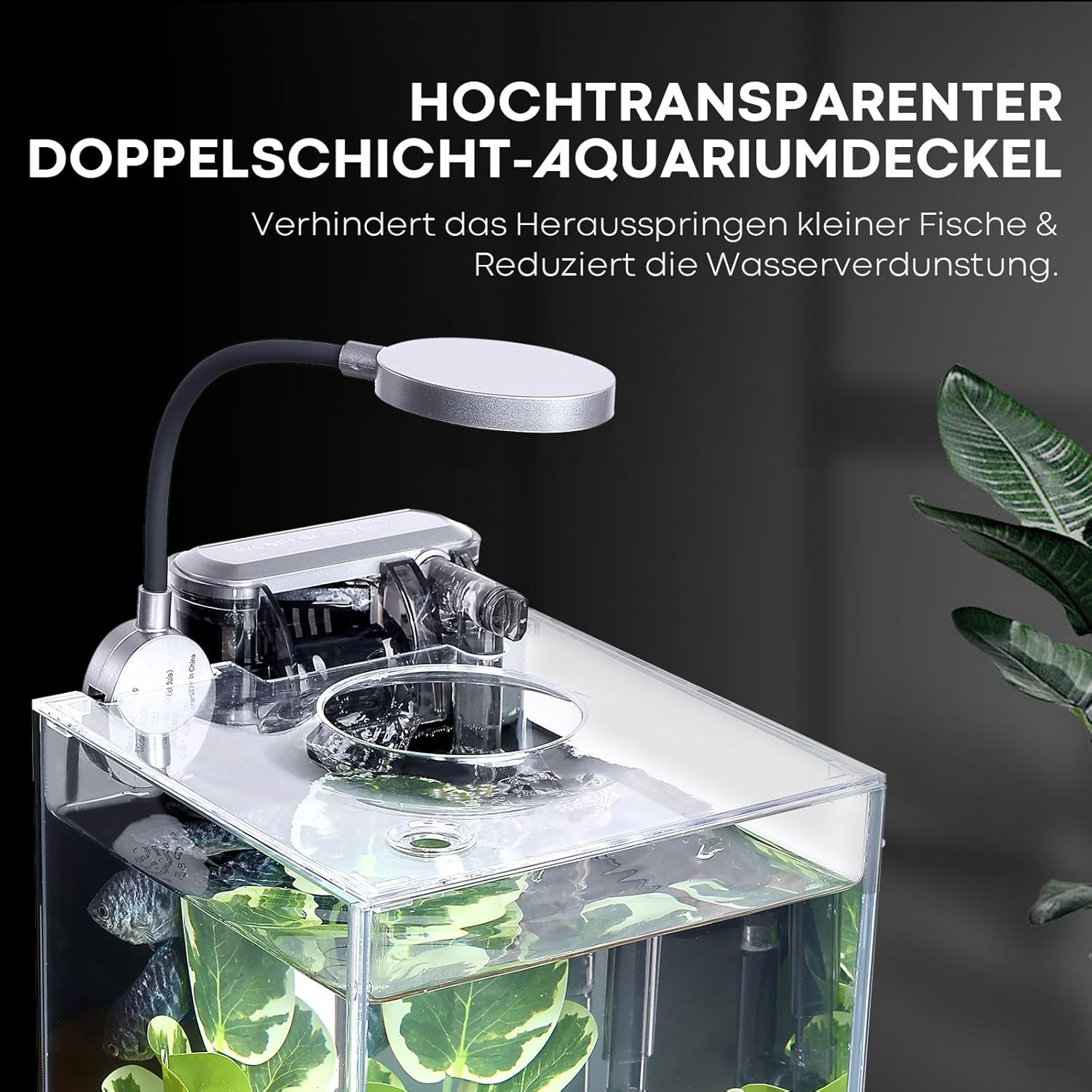 Hochwertiges kristallklares Glas für beste Sicht – Hergestellt aus ultraklarem 4-mm-HD-Glas mit 92 % Lichtdurchlässigkeit, genießen Sie eine brillante, verzerrungsfreie Sicht auf Ihre Fische. Der elegante schwarze EVA-Boden und der passende Deckel schützen vor Auslaufen und verhindern