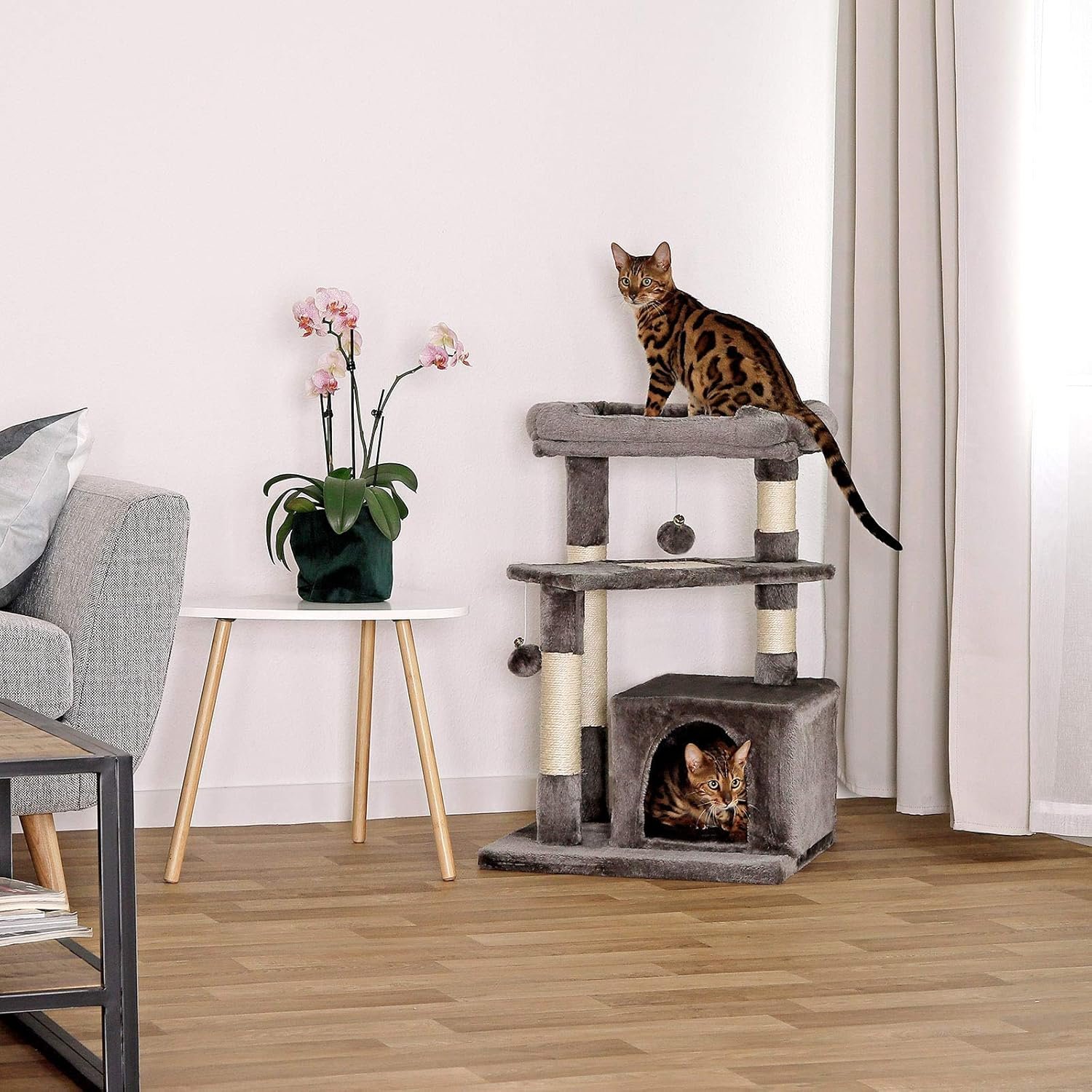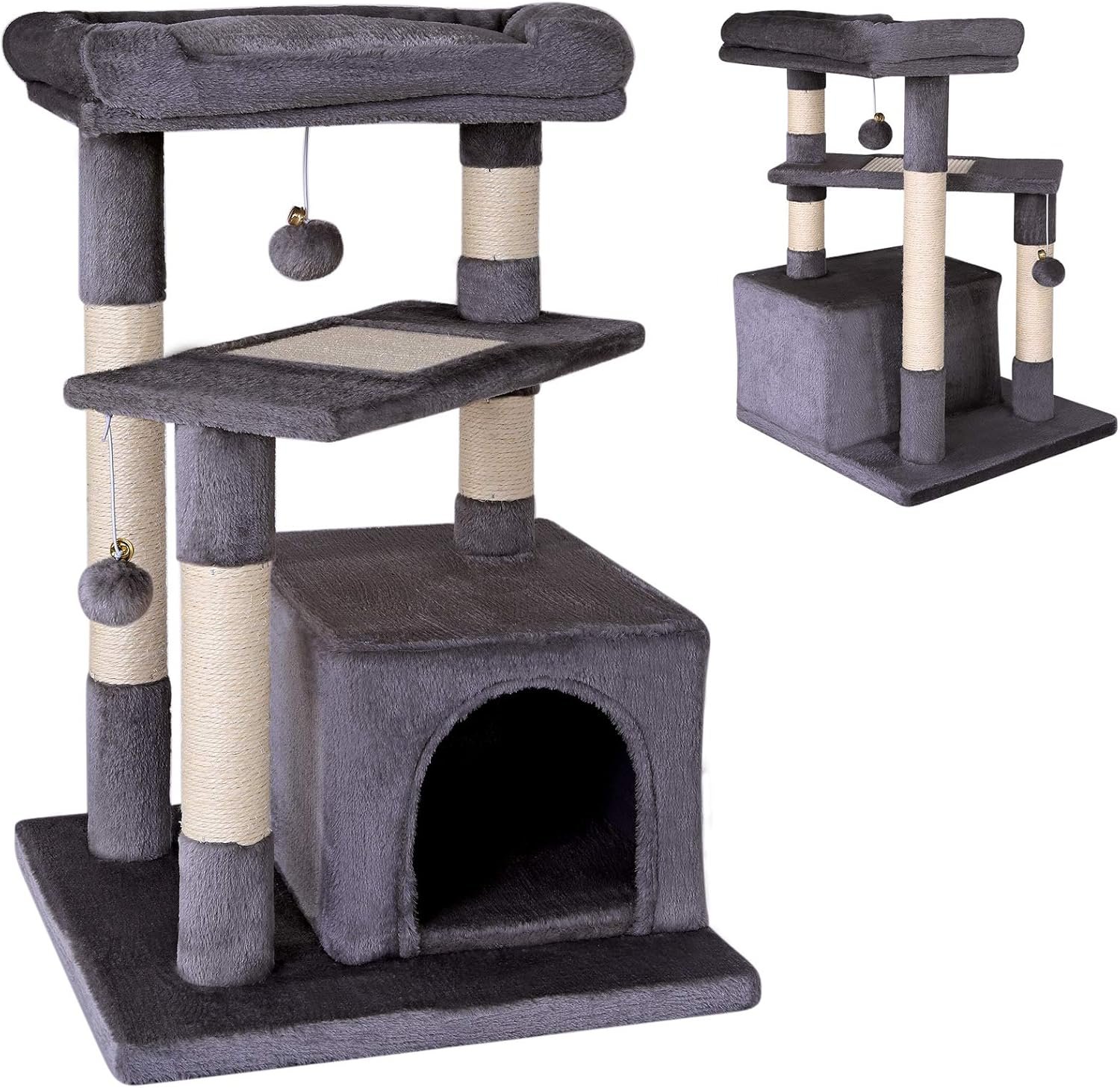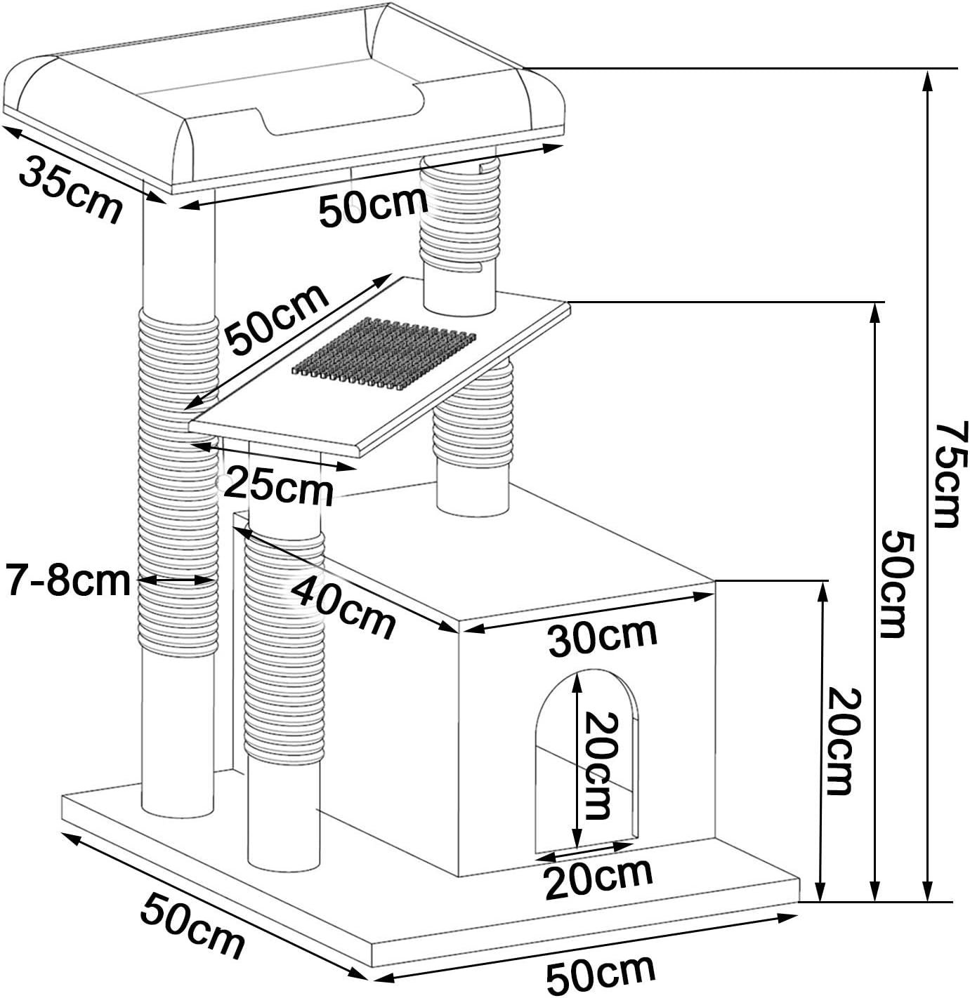 Maße und Farben: Dieses hochwertige Katzenzubehör hat die Maße 50 x 50 x 75 cm, die Verstecke sind 40 x 30 x 25 cm groß und die Plattform ist 45 x 30 cm groß. Dieses langlebige Katzenspielzeug ist in Hellgrau und Dunkelgrau erhältlich.