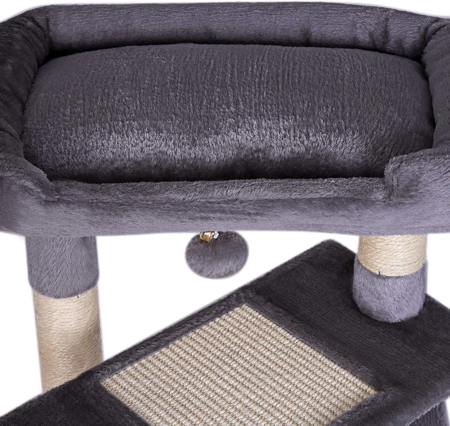 Auf der linken Seite des Katzenkratzbaums befindet sich ein weiterer Plüschball zum Spielen.