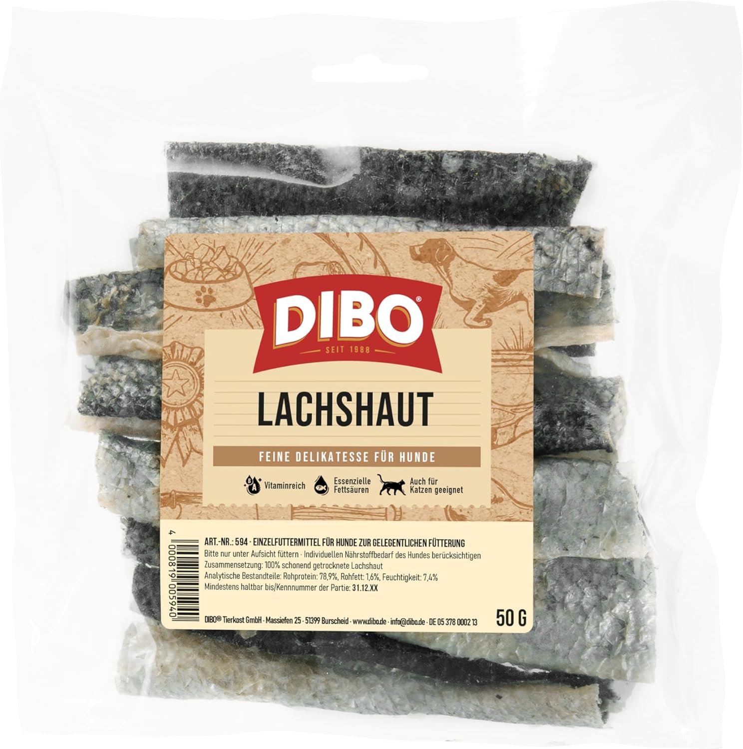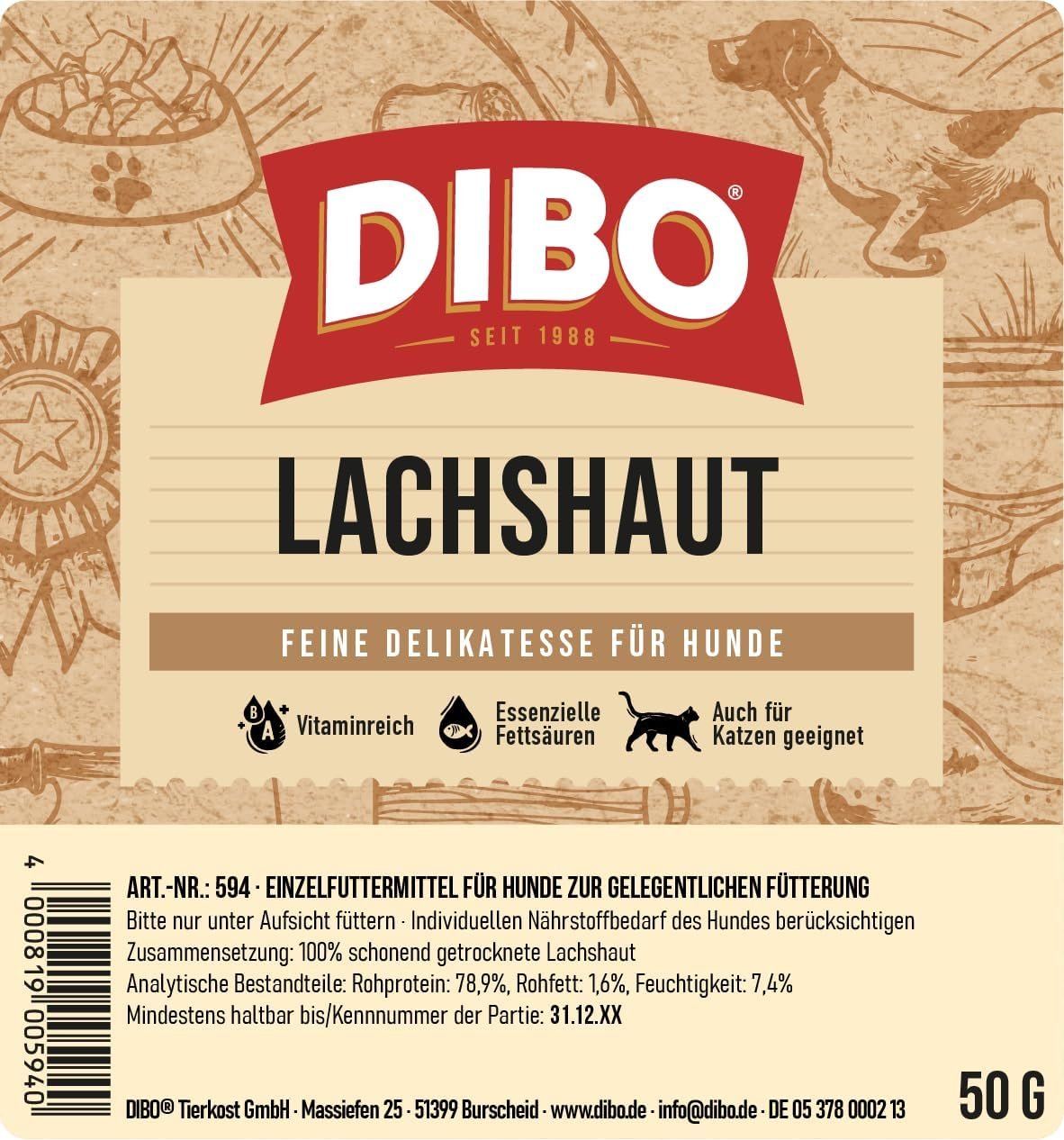 DIBO Lachshaut Für Hunde jeder Größe Geeignet für empfindliche und allergische Hunde Sorgt für gesunde Haut und glänzendes Fell Fördert die Gesundheit durch Omega-3-Fettsäuren Enthält wenig Fett
