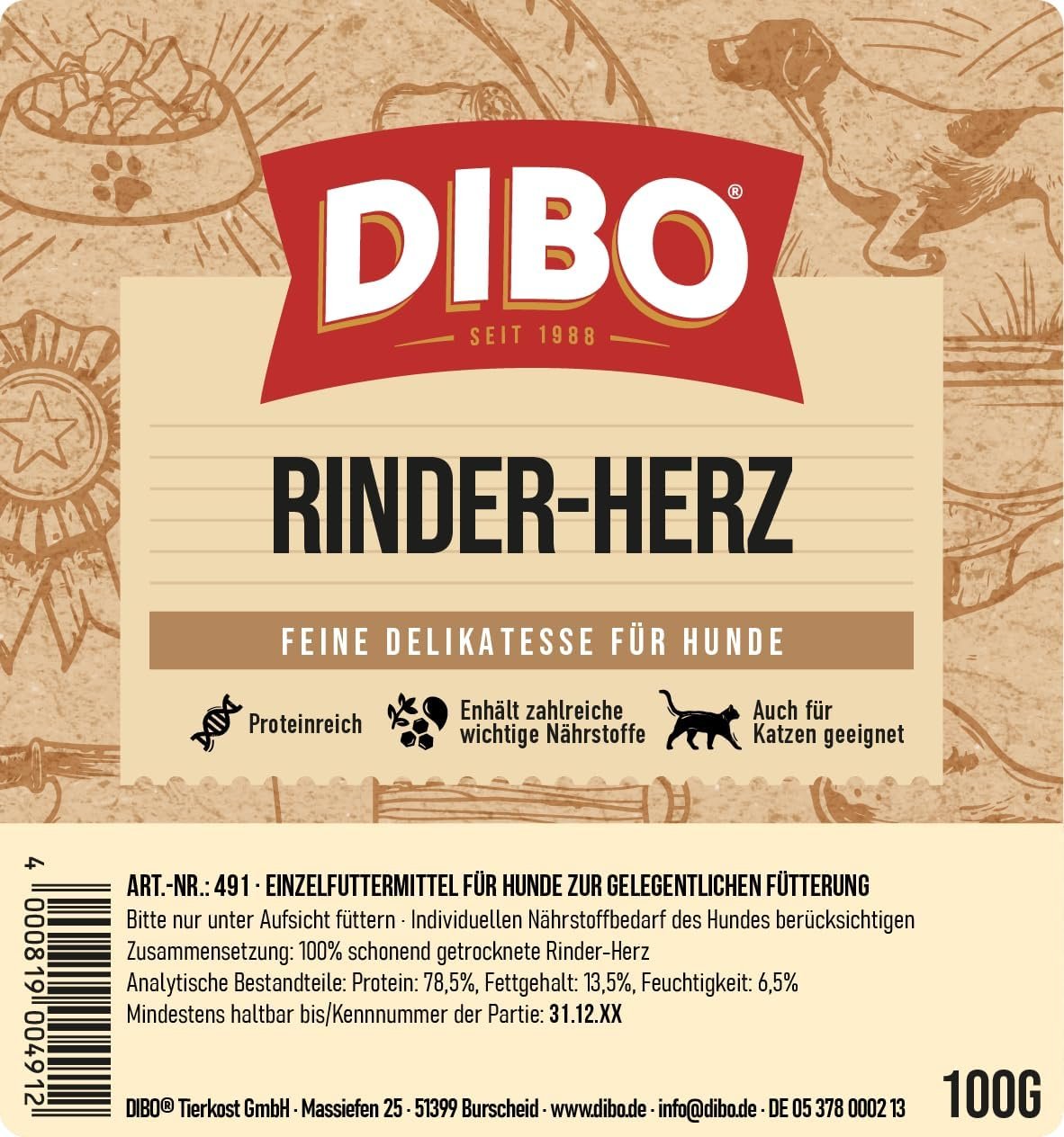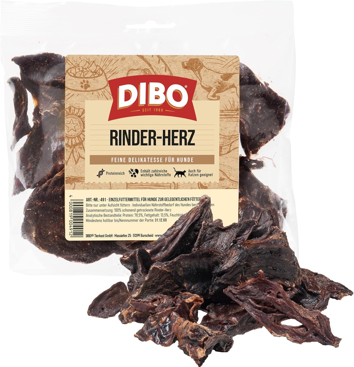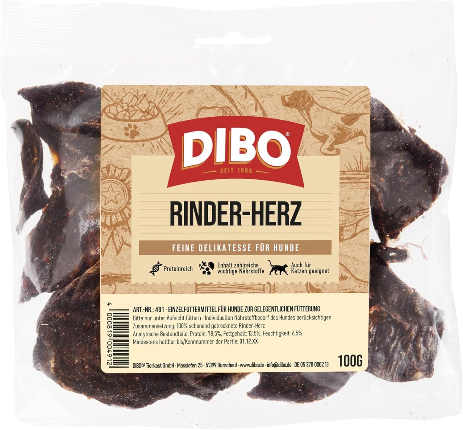 DIBO Rinderherz, entfettet, 100 g Beutel, der kleine natürliche Kausnack oder Leckerbissen für zwischendurch, Hundefutter, Qualitäts-Kauartikel ohne Chemie