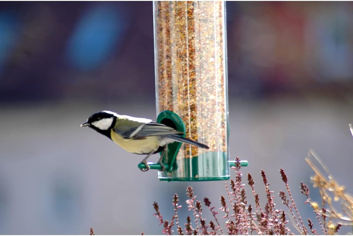 Das Acrylglas-Silo schützt das darin befindliche Vogelfutter zuverlässig vor Regen und Schmutz