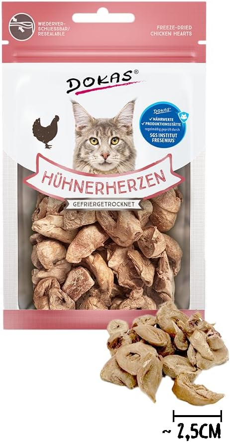 Lieferumfang: 6 x 15 g Dokas Hühnerherzen gefriergetrocknet, Premium-Leckerli in praktischer Häppchengröße zum Wiederverschließen, Ergänzungsfuttermittel für Katzen