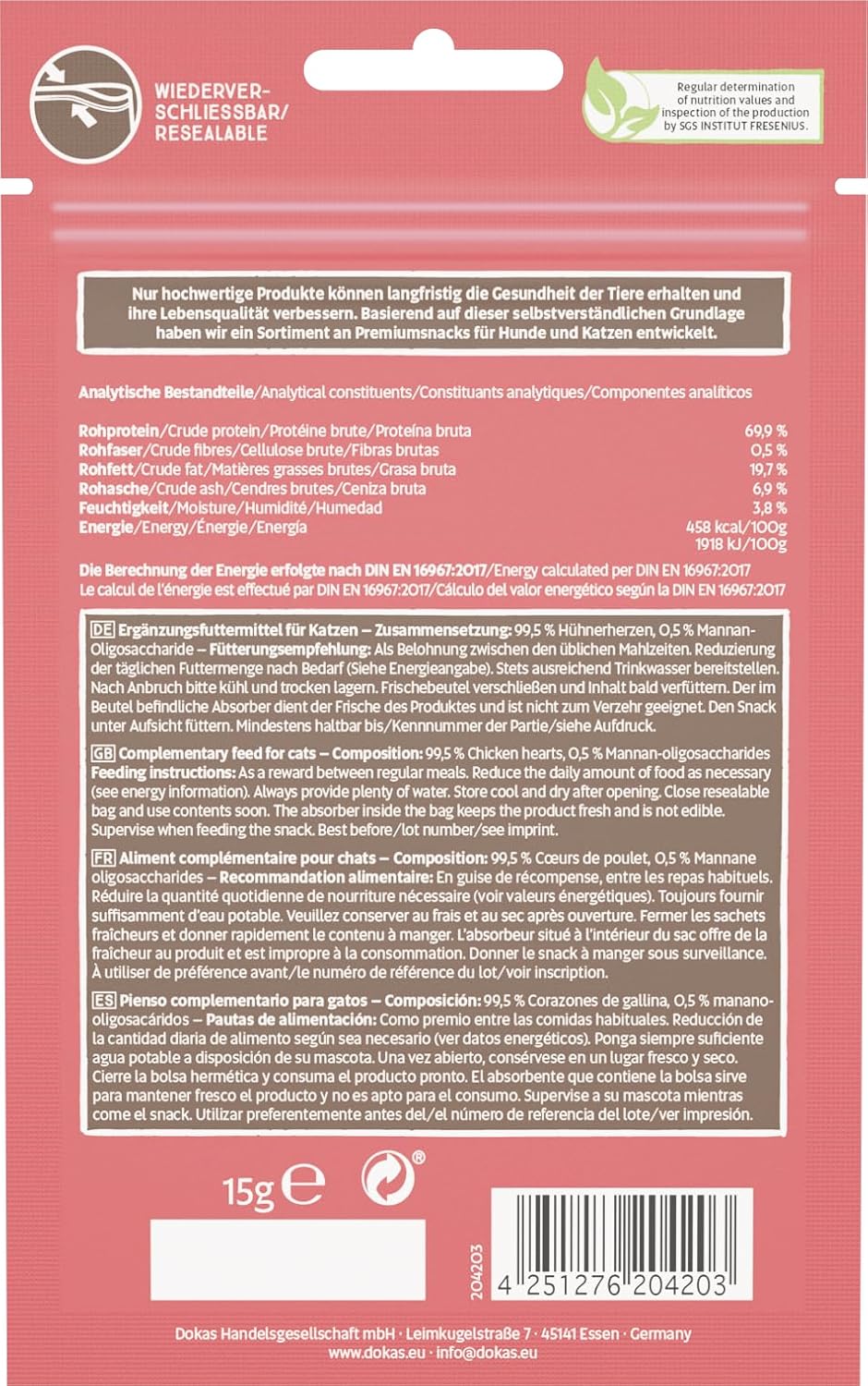 Dokas-Katzensnacks unterliegen in festgelegten Abständen regelmäßigen Qualitätskontrollen hinsichtlich Nährwerten, Produktionsstätten und Lieferanten