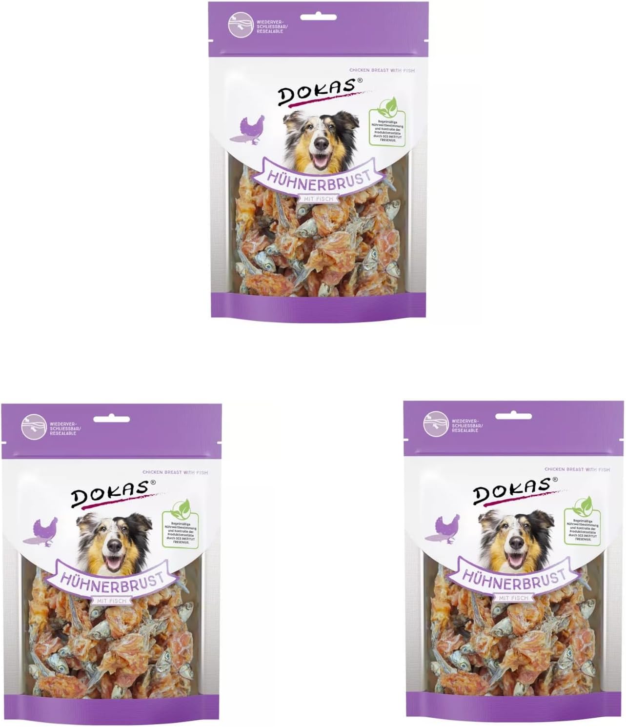 Leckerer Kausnack für Hunde – Dokas Hähnchenbrust mit Fisch ist umhüllt von zartem und fettarmem Hähnchenfilet und eignet sich hervorragend für Hunde in allen Lebensphasen