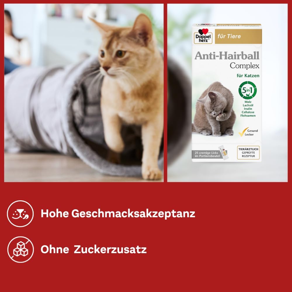 PACKUNGSINHALT Eine Packung Doppelherz für Tiere Anti-Haarball-Komplex für Katzen enthält 25 cremige Lecklecks. Ohne Zusatz von Zucker, Farbstoffen und künstlichen Aromen.