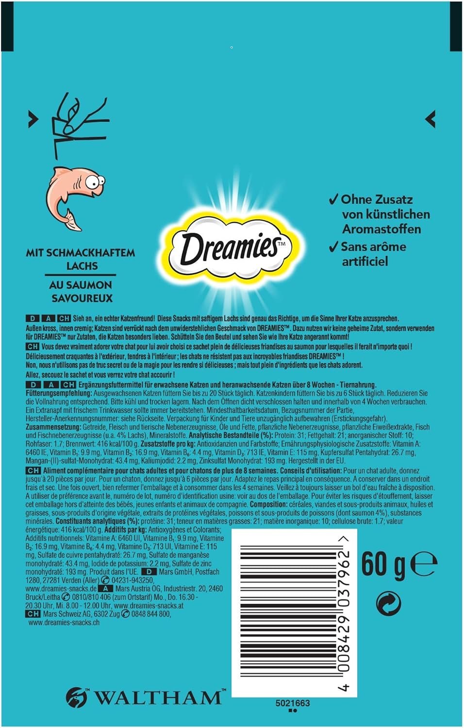 Dreamies Katzensnacks Classic mit Lachsgeschmack, 6 Packungen (6 x 60 g)