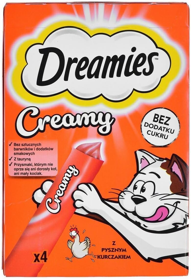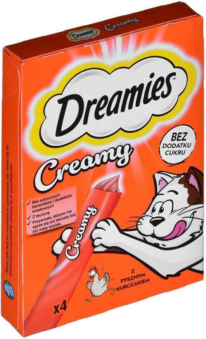 20 Portionsbeutel (5 x 4 x 10 g) Dreamies Katzensnacks cremige Snacks mit Huhn – lecker cremiger Geschmack Ein leckerer Snack für zwischendurch: Dreamies cremige Snacks sind leckere Katzensnacks und verwöhnen Ihre Samtpfote auf vielseitige Weise. Der Snack hat einen hohen Feuchtigkeitsgehalt und eine wunderbar cremige Konsistenz. Dank des feinen Geschmacks erfreut sich der cremig-weiche Katzensnack großer Beliebtheit. Dreamies Creamy Snacks ist ein Ergänzungsfuttermittel und eignet sich auch für junge Katzen. Es enthält Taurin und kommt ohne unnötige Zusatzstoffe in Form von Zucker oder künstlichen Farb- und Aromastoffen aus. Ihre Katze wählt aus mehreren leckeren Sorten. Dreamies Creamy Snacks im Überblick: leckeres Ergänzungsfuttermittel für Katzen. Auch für Kätzchen und heranwachsende Kätzchen geeignet. Zum Verwöhnen: Ideal als leckerer Snack für zwischendurch. Köstliche Creme: cremige Konsistenz, hoher Feuchtigkeitsgehalt. Zu Fleisch oder Fisch: als Quelle wertvoller Proteine. Enthält Taurin: wichtig für die normale Sehkraft. Kein zugesetzter Zucker. Ohne künstliche Farb- und GeschmackszusätzeKöstliche Sorten: Auswahl verschiedener GeschmacksrichtungenIndividuell verpackt: perfekt für unterwegsZusammensetzung: Fleisch und tierische Nebenerzeugnisse (darunter 4 % Huhn), pflanzliche Nebenerzeugnisse, Öle und Fette, Milch und Milchprodukte (darunter 0,5 % Milcheiweiß).