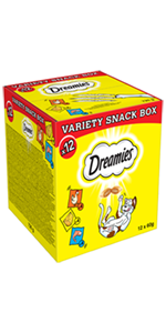 Lieferumfang: 12 x 60 g Dreamies in der praktischen Sorten-Snack-Box. Großpackung: Katzenfutter mit Huhn, Fisch und Käse. Nur 2 kcal pro Stück. Knuspriger Snack für Stubentiger und alle, die gerne draußen sind.