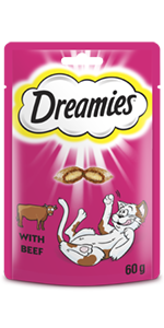 Wenn der Beutel raschelt, kommen die Pfoten sofort heraus – in dem Wissen, dass die herrliche Kombination aus Dreamies Geschmack und Textur das kleine Herz Ihrer Katze höher schlagen lässt.