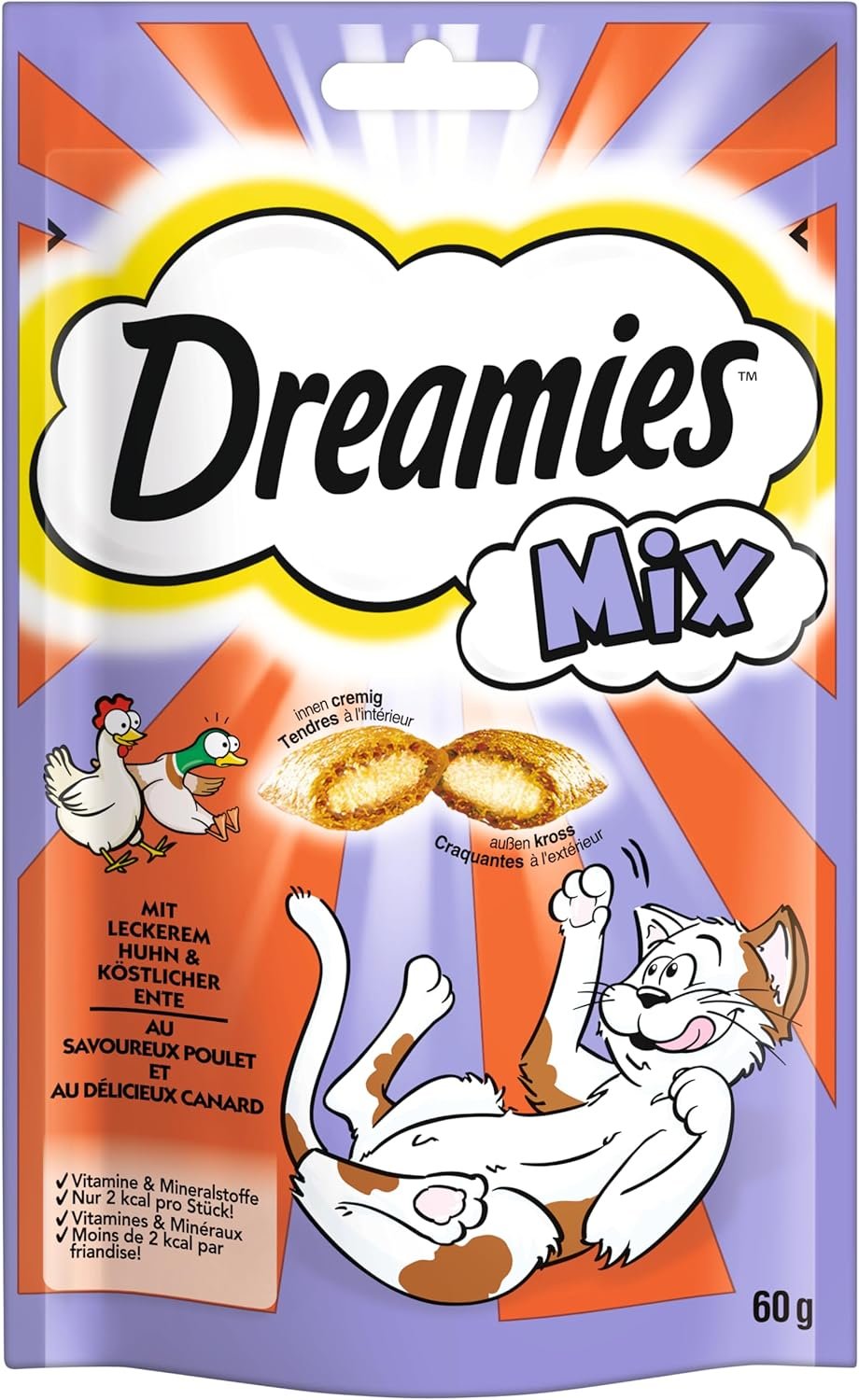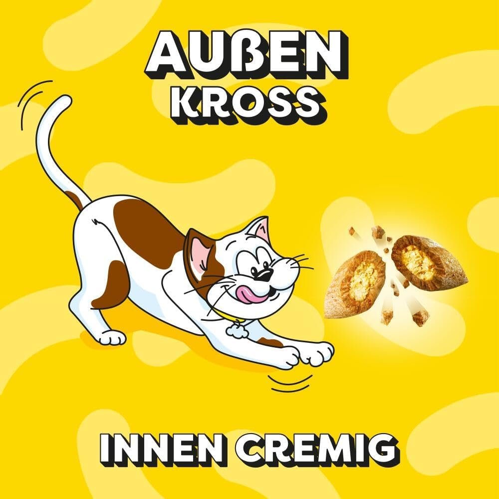 Ein Katzentraum wird wahr: Jetzt wissen wir, wovon Katzen schon immer geträumt haben – den köstlich knusprigen Dreamies-Klassiker mit Huhn und Ente im Mix – außen knusprig und innen cremig