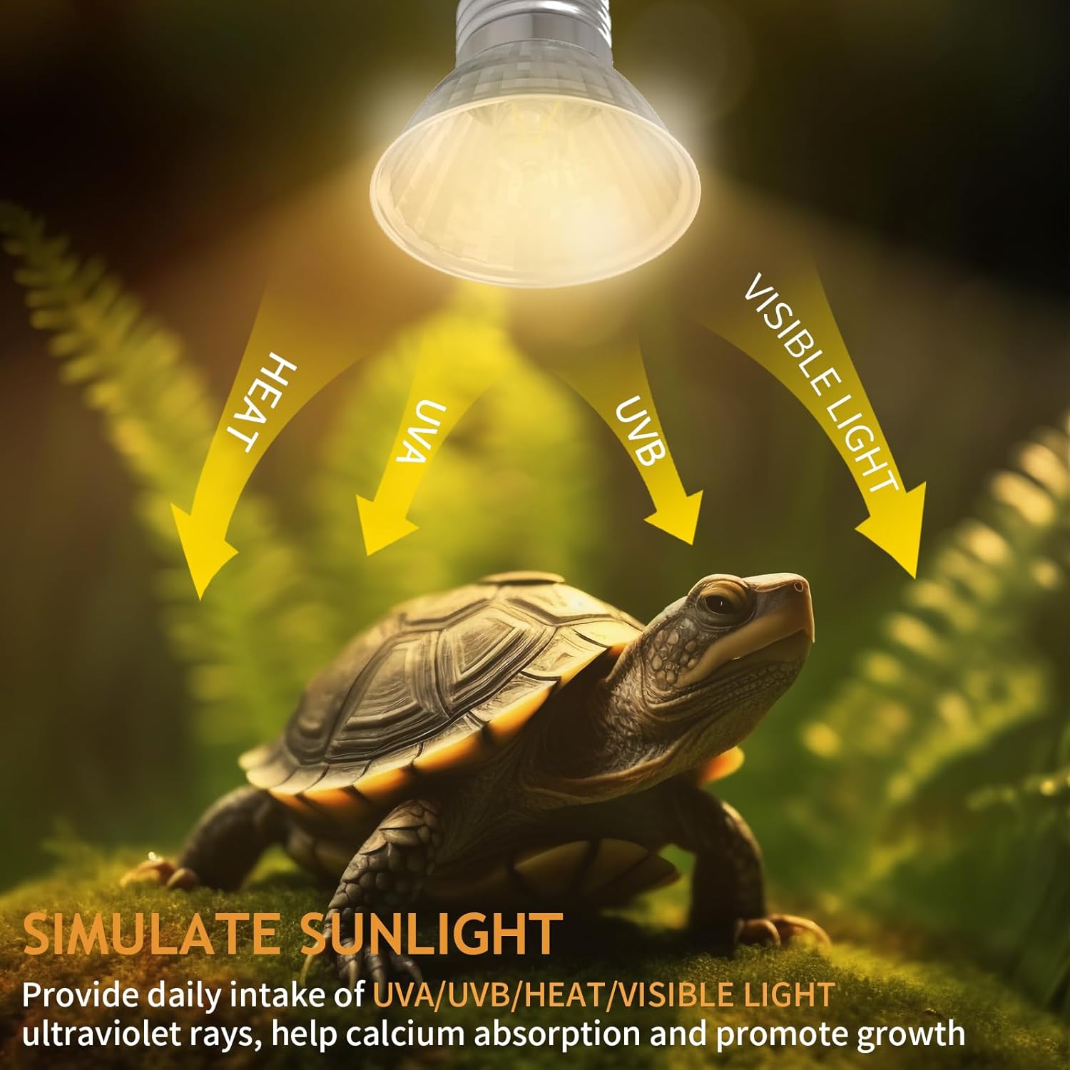 Machen Sie Ihre Reptilien gesünder: Die Glühbirne der Schildkröten-Wärmelampe von EASYIVY liefert hochwertiges UVB und UVA, 3 % UVB-Licht fördert die Synthese von Vitamin D3, erhöht die Kalziumaufnahme und 97 % UVA-effiziente Wärmeenergie verdaut Nahrung, was für das Knochenwachstum und die Vorbeugung von Stoffwechselstörungen unerlässlich ist.