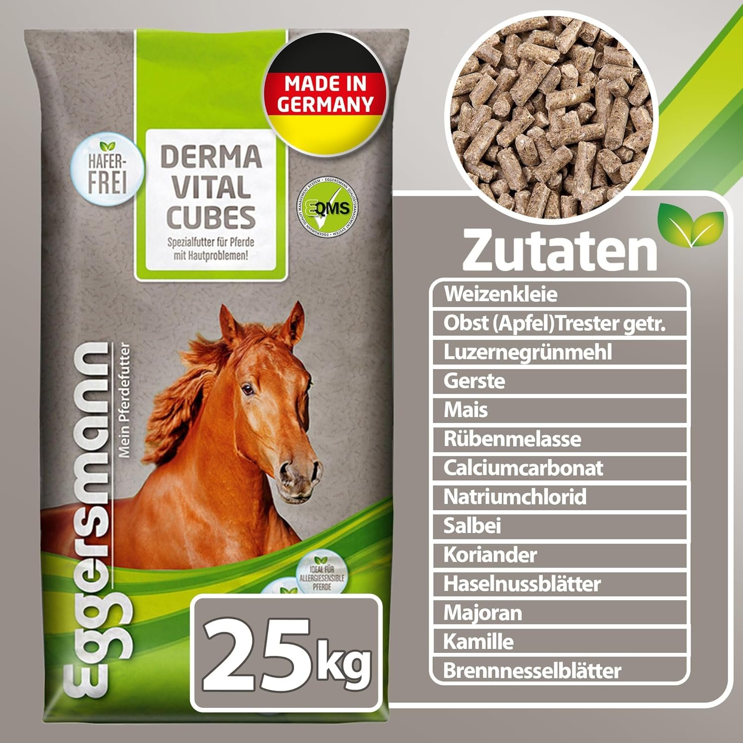 Fördert die Verdauung: Das Pferdefutter enthält einen hohen Anteil an Rohfasern und Fruchttrester, die die Verdauung unterstützen. Durch die kombinierten Nähr- und Vitalstoffe der Derma Vital Cubes können die Stoffwechselprozesse gefördert werden.
