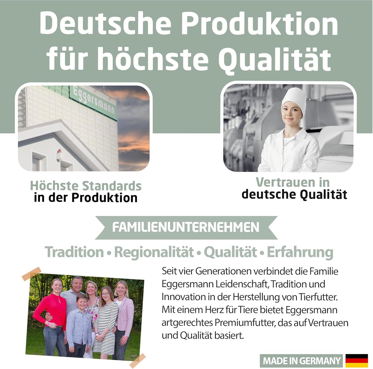 Deutsche Produktion: Seit mehr als 50 Jahren steht Eggersmann für hochwertige Futtermittel. Unsere Produkte werden nach höchsten Qualitätsstandards in unserer eigenen Produktion im Weserbergland hergestellt.