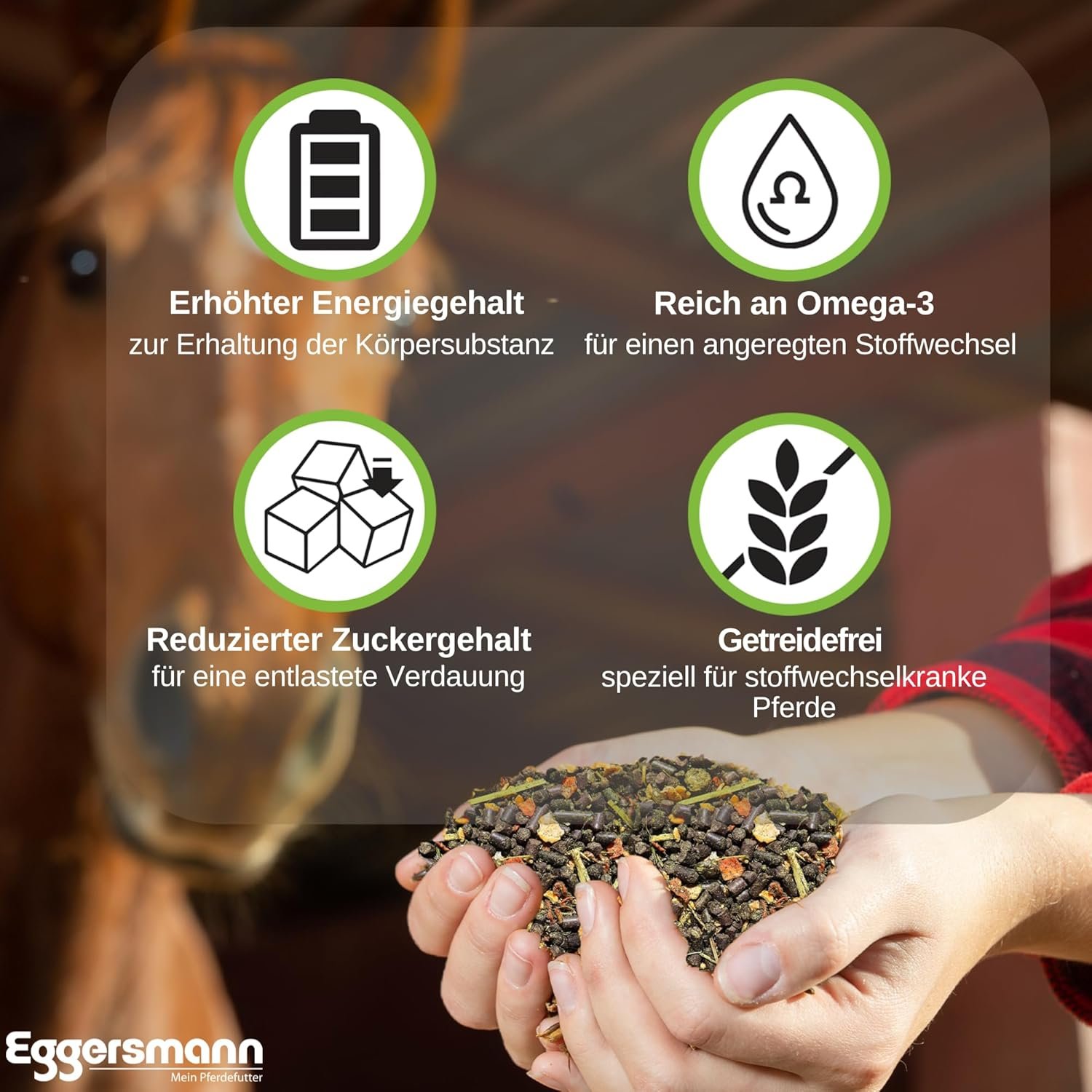 Omega 3: Das Eggersmann Pferdemüsli ist reich an Omega-3- und Omega-6-Fettsäuren für einen angeregten Stoffwechsel.