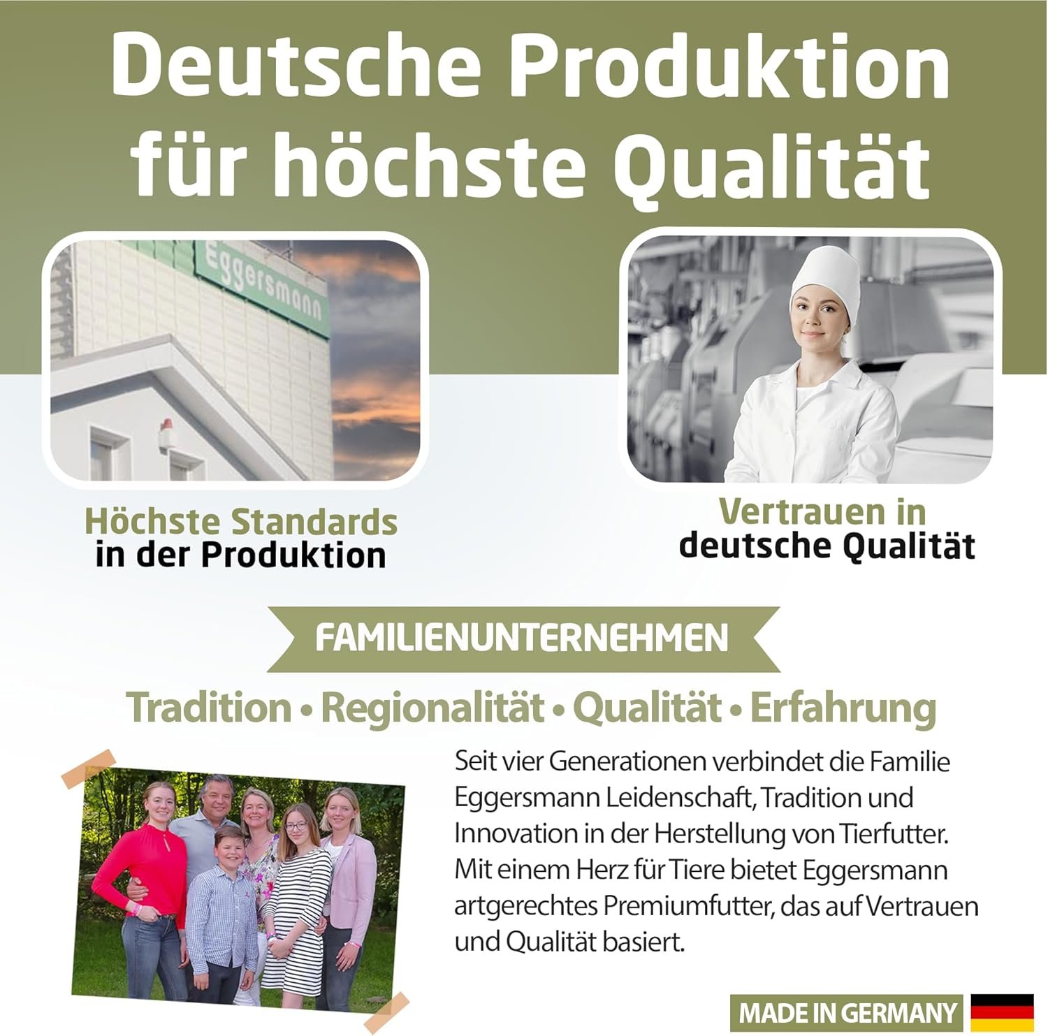 Familientradition und deutsche Qualität: Eggersmann steht für vertrauensvolle Tiernahrung „Made in Germany“. Mit einer Kombination aus traditionellem Wissen und modernster Produktionstechnologie sorgen wir für höchste Futterqualität für Ihr Haustier.