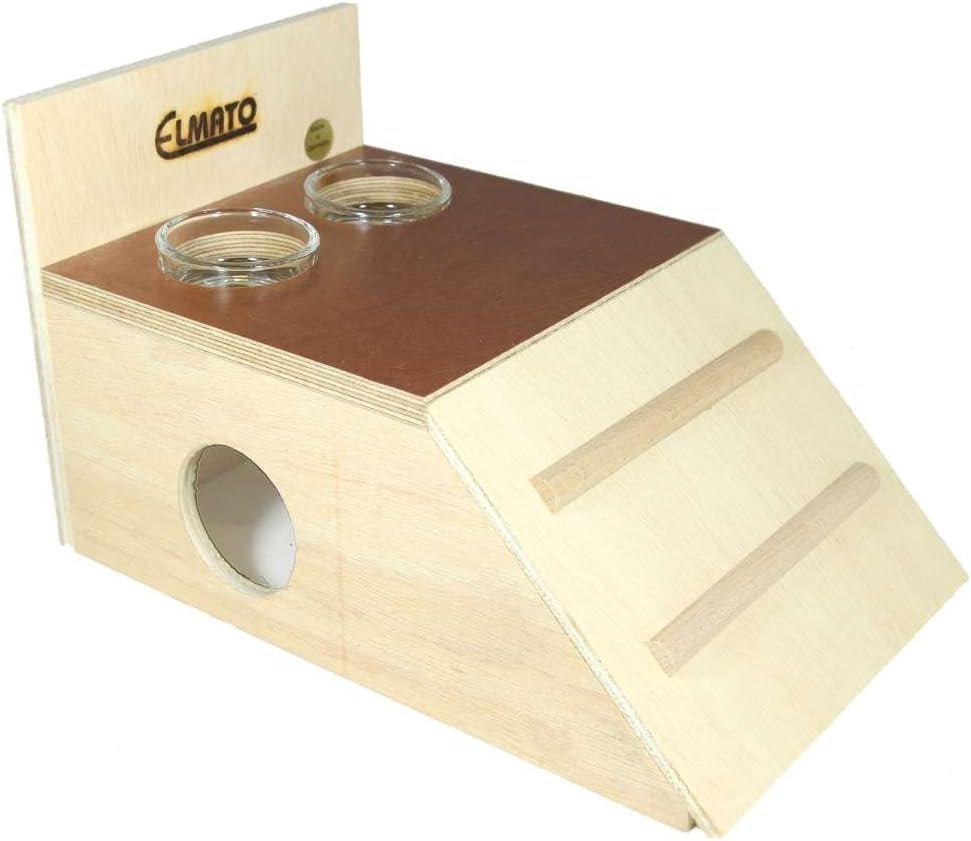 Ordnung und Sauberkeit sind beim Füttern besonders wichtig. Die Elmato-Snackbar mit integriertem Futterplatz wird mit Sicherheit zum neuen Lieblings-Futterplatz für Ihre Nagetierfreunde. Mit seiner kompakten Grundfläche ist das Nagerhaus ideal für kleinere Käfige und Volieren. Durch die Fressoase ist der Ruhe- und Fressbereich klar voneinander getrennt. Den Fressplatz erreichen Ihre Lieblinge über eine angebrachte Rampe, die die Tiere zu leckerem Futter und Getränken in zwei integrierten Glasnäpfen führt. Die Schalen können entnommen und gereinigt sowie ausgetauscht werden. Das Multiplexholz im Obergeschoss ermöglicht zudem eine einfache Reinigung bei Verschmutzung. Im unteren Rastbereich wartet jedoch eine gemütliche Höhle auf die Nager. Die Tiere erhalten die Möglichkeit, sich vom Tieralltag zu erholen und verschiedene Untergründe aus Streu, Moos oder Stroh zu ertasten. Dank der abgeflachten Seite lässt sich das Haus problemlos seitlich platzieren und nimmt somit wenig Platz ein. Effizient und schön!