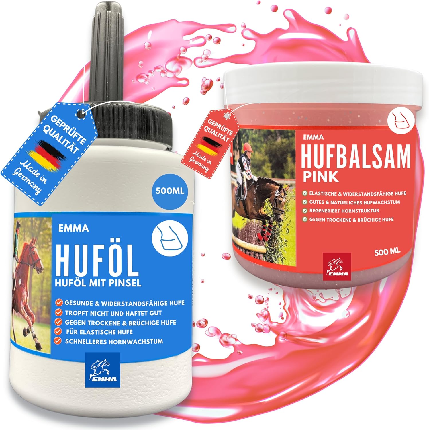 All-in-one Hufset – Hufpflegeset für Stall, Weide und Turnier: Huföl 480 ml + Hufbalsam rosa 500 ml. Fördert Hufgesundheit, Glanz und dauerhafte Hornqualität. UNTERSTÜTZT DIE TÄGLICHE PFERDEPFLEGE – Ideal für Ponys, Barhufpferde und Sportpferde. Gehört in jede Putztasche, Putzbox, Putzkoffer. Geeignet für Hufpflege, Pferdezubehör, Reinigungswerkzeuge, Zauberbürste, Striegel und EMMA Hufpflegeprodukte.