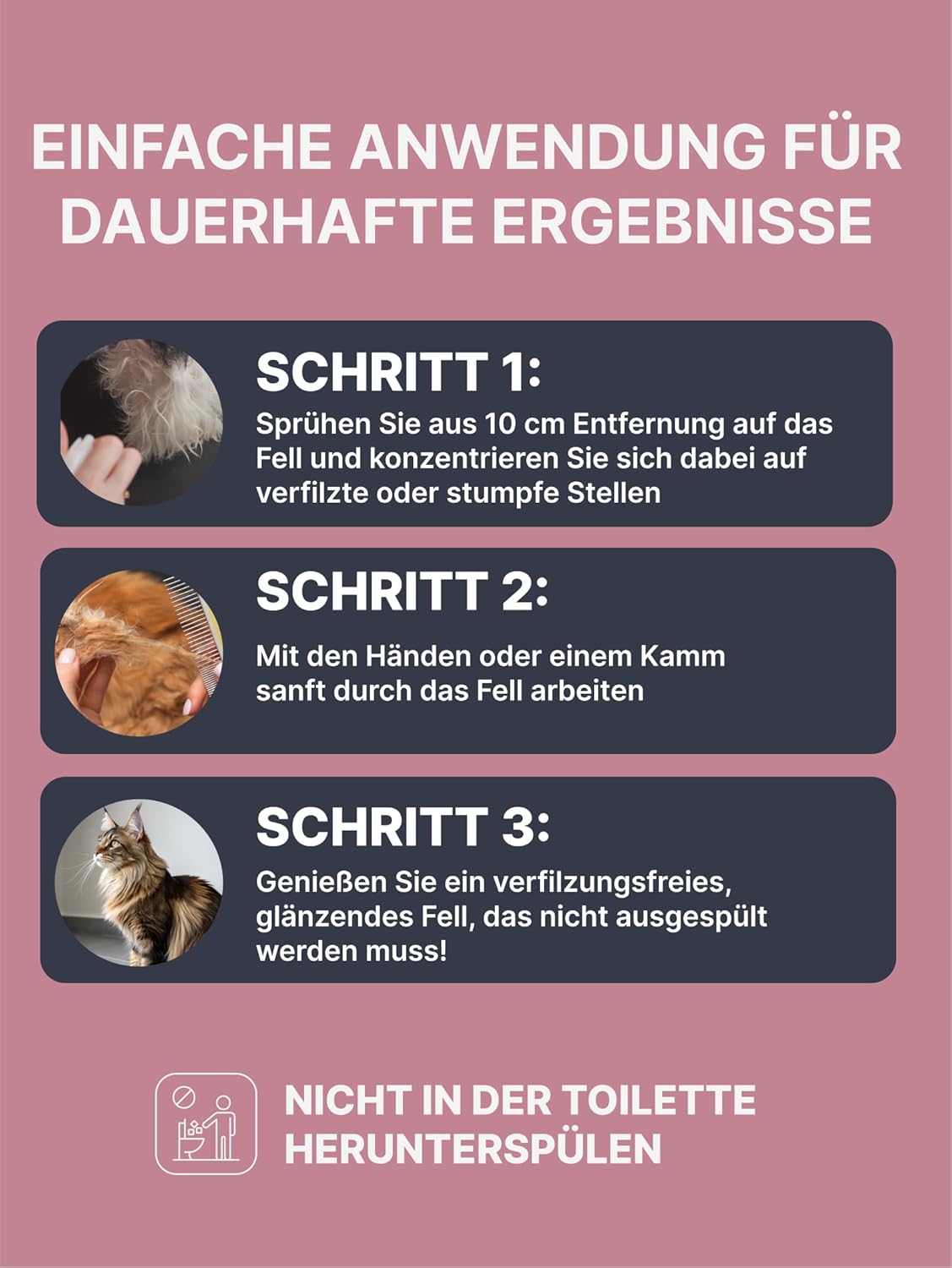 Multifunktionaler Einsatz: Dieses Entwirr-Hundespray kann auch als Entwirrer für Katzenhaare verwendet werden. Für beste Ergebnisse wird die Anwendung nach der Haarwäsche mit Kokosnussöl für Hunde und Hyaluronsäure empfohlen. Im Abstand von 10 cm zum Fell sprühen.